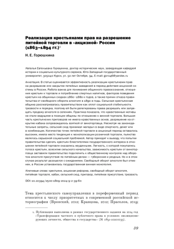 Тема крестьянского самоуправления в пореформенный период относится к числу приоритетных в современной российской историографии (Вронский, 2012; Кравцова, 2012; Прасолов, 2019; Старосек, 2019 и др.). Это связано с пристальным вниманием исследователей к историческому опыту модернизации страны, привлечения населения к реализации государственных программ обновления. Однако до последнего времени в научной литературе не раскрыт вопрос о реализации крестьянами права на разрешение питейной торговли, что имело место в России в рамках реализации винной реформы 1863 года. Первые шаги по его изучению были сделаны С. В. Богдановым (Богданов, 2008), Н. Е. Горюшкиной (Горюшкина, 2022), Е. М. Берестовой, А. М. Субботиной (Берестова, Субботина, 2022). Названные авторы сошлись во мнении, что в акцизный период правительство побуждало крестьян выступить «правительственными агентами» в области питей и решить на сходке — быть кабаку на принадлежавшей им земле или не быть. Но объяснений, почему разрешительное право в крупных сельских поселениях было затем изъято из ведения сельских обществ и передано в руки питейных присутствий, а позднее и вовсе свободный оборот алкоголя заменен казенной винной операцией, историки до сих пор не дали