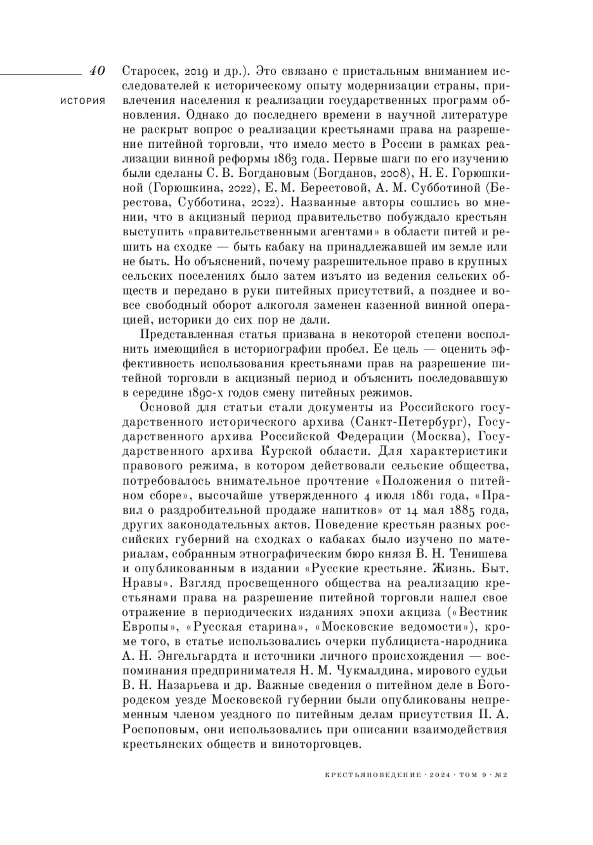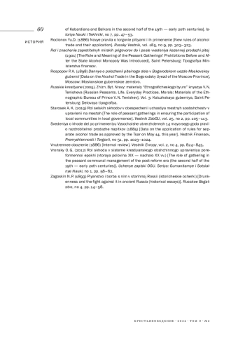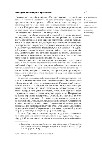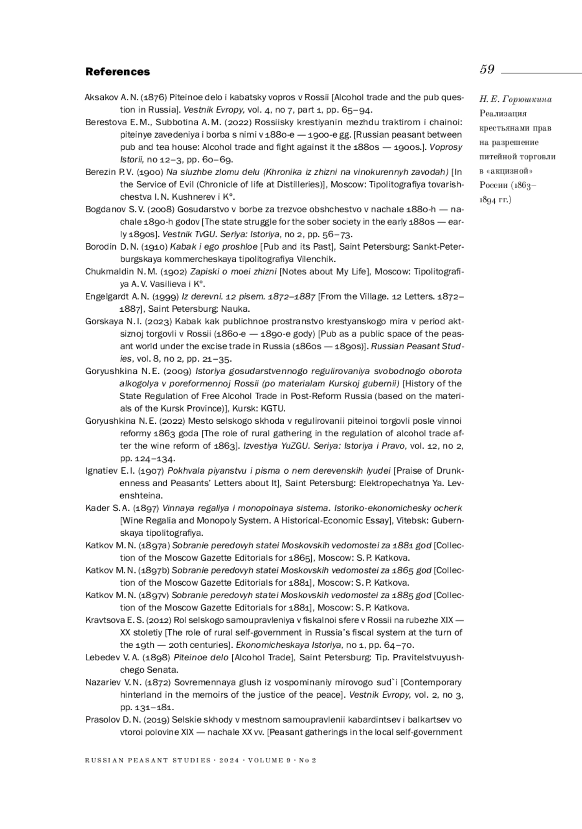 8. 	Горская Н. И. (2023). Кабак как публичное пространство крестьянского мира в период акцизной торговли в России (1860-1890-е годы) // Крестьяноведение. Т. 8. № 2. С. 21-35.  EDN: QDRDDJ