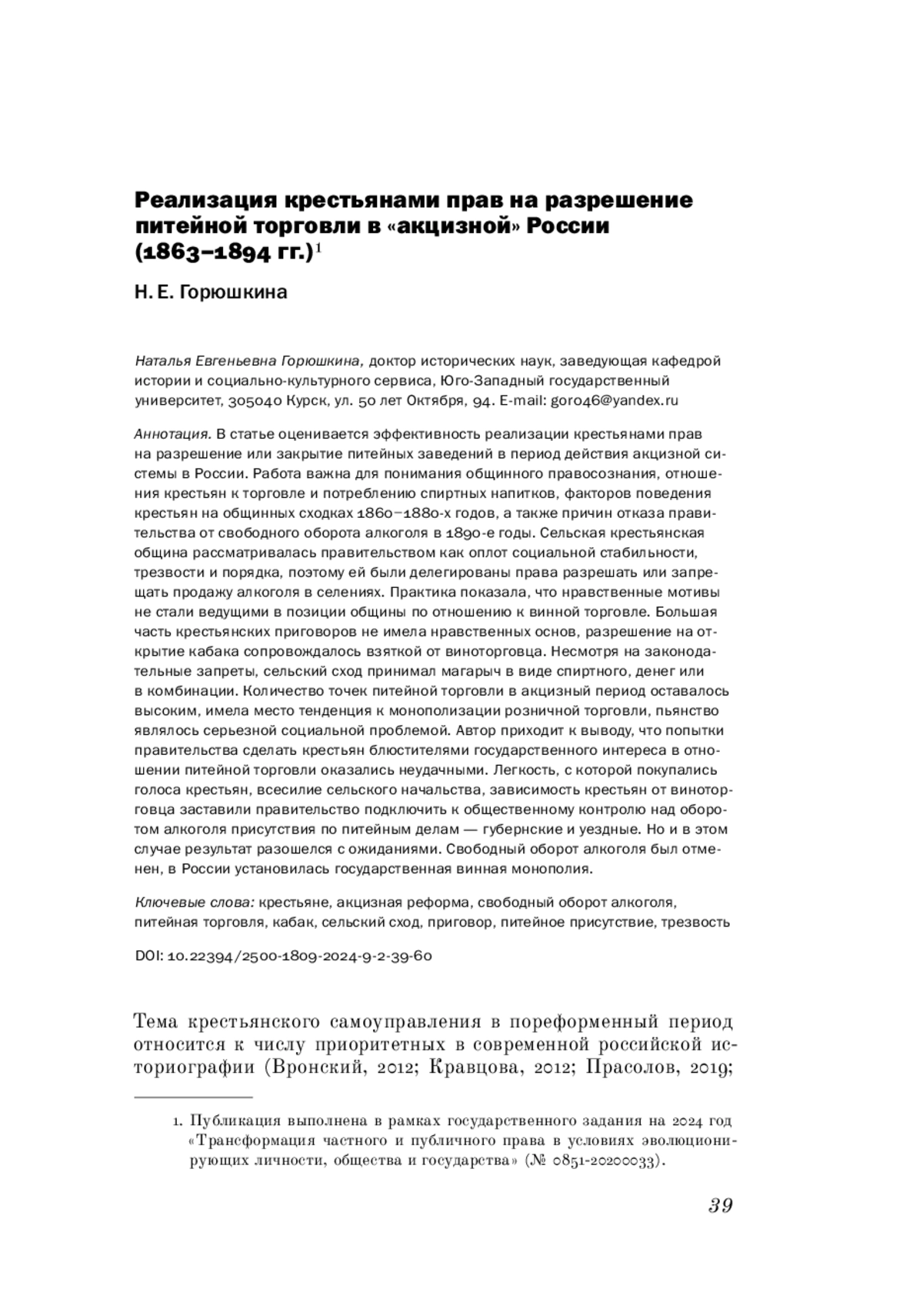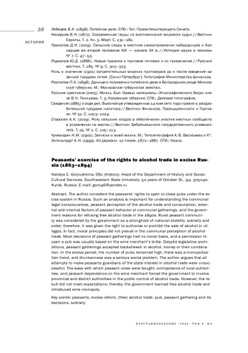 10. 	Горюшкина Н. Е. (2022). Место сельского схода в регулировании питейной торговли после винной реформы 1863 года // Известия Юго-Западного государственного университета. Серия: История и право. Т. 12. № 2. С. 124-134.  EDN: JMKZAH