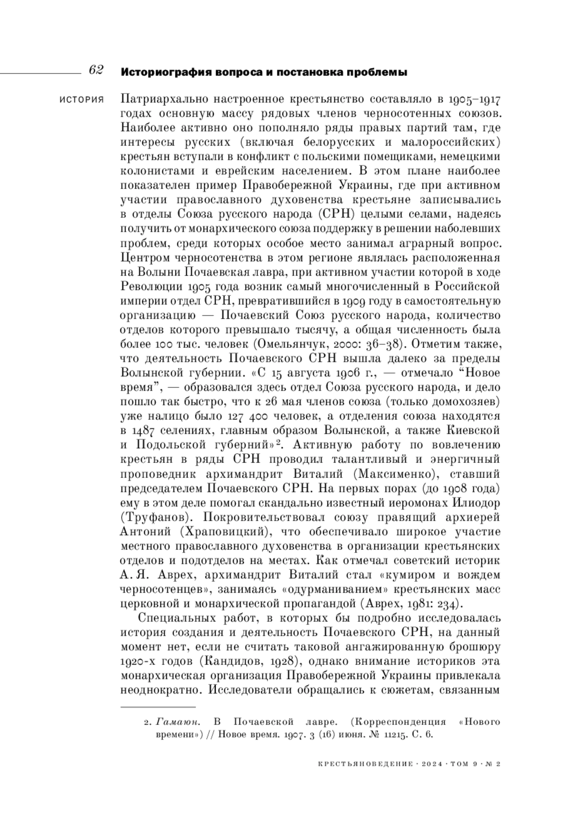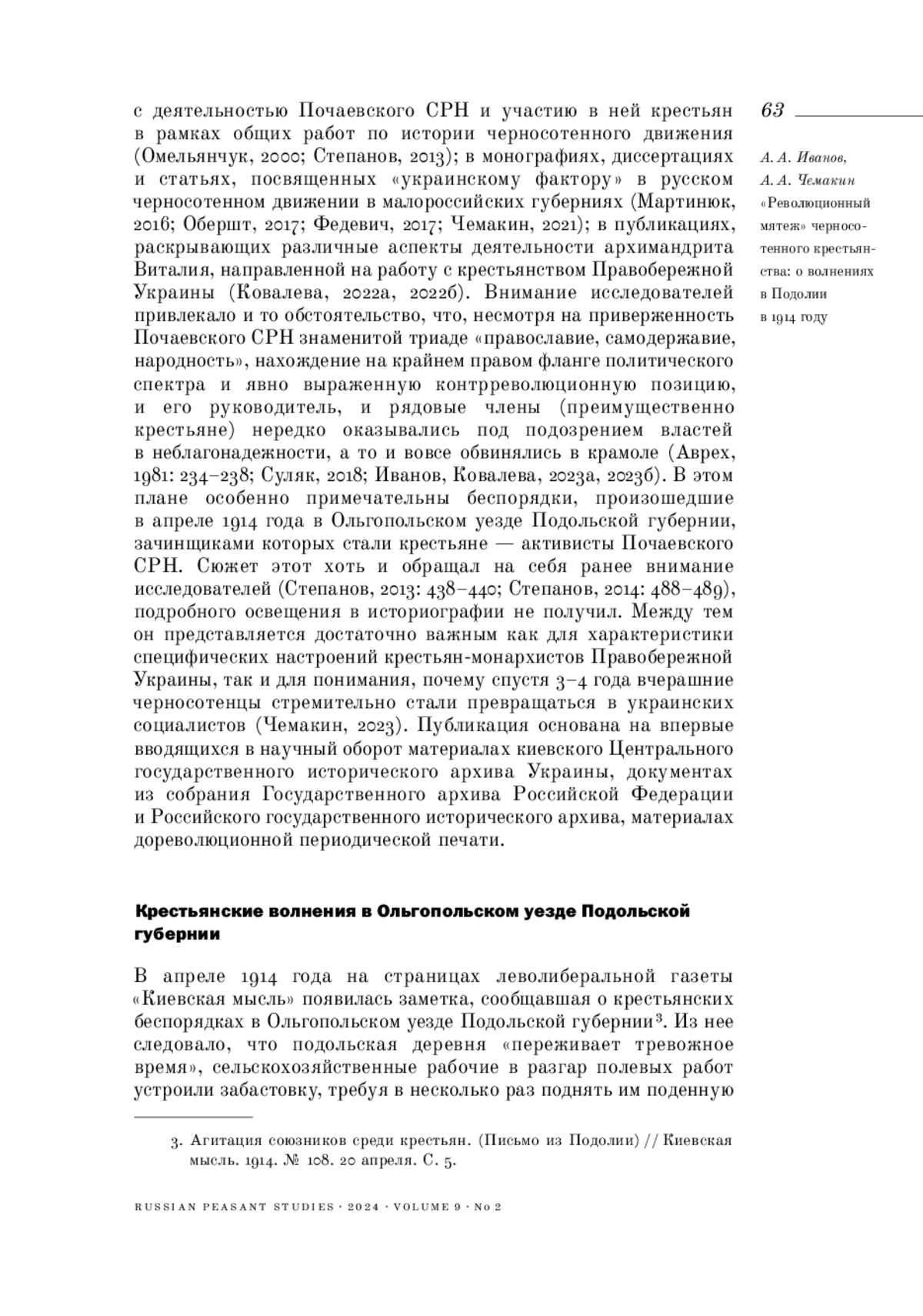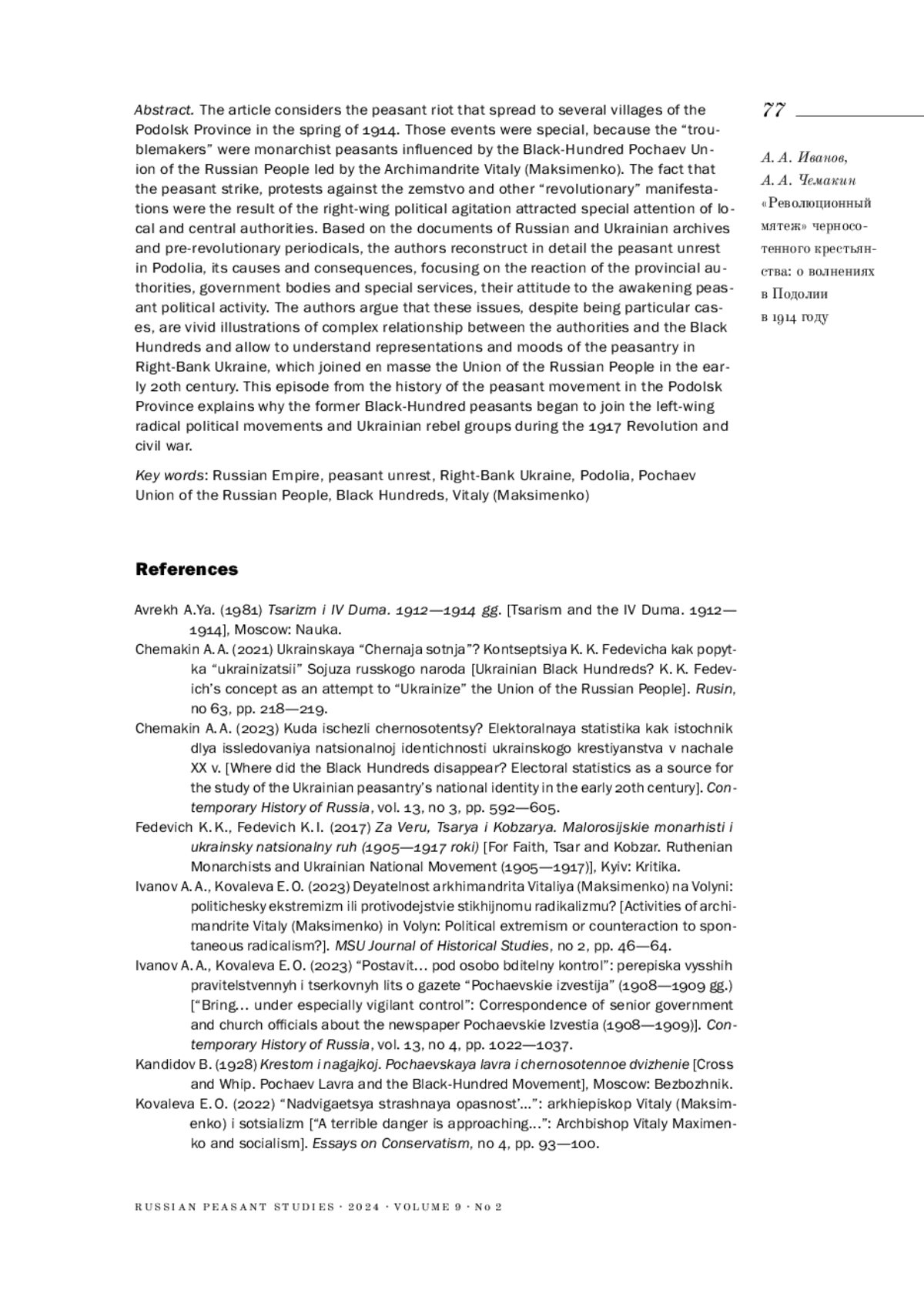 Статья посвящена крестьянским волнениям, охватившим несколько сел Подольской губернии весной 1914 года. Особенность сложившейся ситуации заключалась в том, что «смутьянами» оказались крестьяне-монархисты, находившиеся под влиянием черносотенного Почаевского Союза русского народа, во главе которого стоял архимандрит Виталий (Максименко). То обстоятельство, что крестьянская забастовка, выступления против земства и другие «революционные» проявления были результатом агитации правых, а не левых сил, вызвало особое внимание местных и центральных властей к данным эксцессам. На документах российских и украинских архивов, а также материалах дореволюционной периодической печати в статье подробно реконструируются крестьянские волнения в Подолии, их причины и последствия. Показана реакция на эти эксцессы спецслужб, губернской и правительственной власти, их отношение к пробуждению крестьянской политической активности. Доказывается, что данный сюжет, несмотря на частный характер, является яркой иллюстрацией к истории непростых взаимоотношений властей с черносотенцами, а также позволяет раскрыть специфику взглядов и настроений крестьян Правобережной Украины, массово записывавшихся в начале XX века в Союз русского народа. Рассмотренный в статье эпизод из истории крестьянского движения в Подольской губернии также во многом позволяет понять, почему в годы Революции 1917 года и последовавшей за ней Гражданской войны бывшие крестьяне-черносотенцы стали массово примыкать к леворадикальным политическим движениям и вступать в украинские повстанческие отряды.