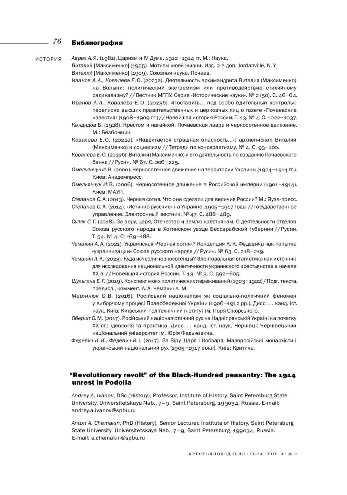 15. Чемакин А. А. (2023). Куда исчезли черносотенцы? Электоральная статистика как источник для исследования национальной идентичности украинского крестьянства в начале XX в. // Новейшая история России. Т. 13. № 3. С. 592-605. EDN: IBUKRU