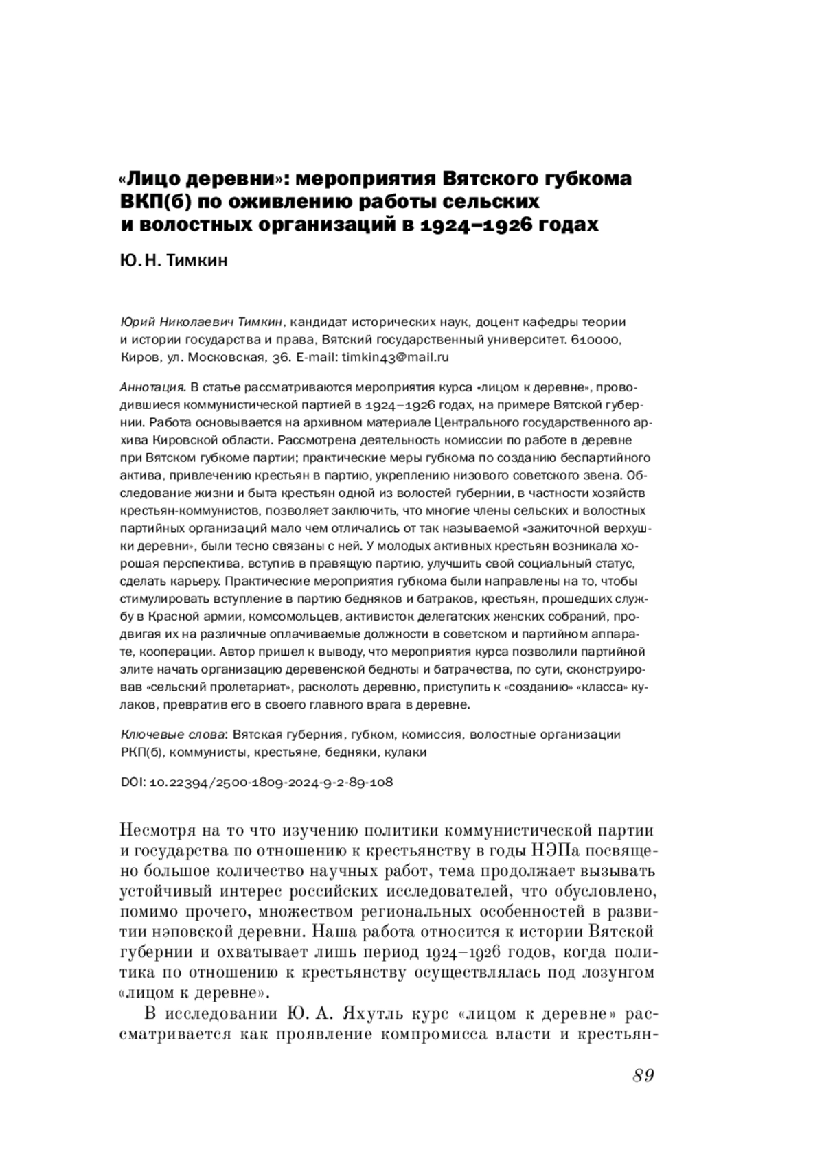 В статье рассматриваются мероприятия курса «лицом к деревне», проводившиеся коммунистической партией в 1924-1926 годах, на примере Вятской губернии. Работа основывается на архивном материале Центрального государственного архива Кировской области. Рассмотрена деятельность комиссии по работе в деревне при Вятском губкоме партии; практические меры губкома по созданию беспартийного актива, привлечению крестьян в партию, укреплению низового советского звена. Обследование жизни и быта крестьян одной из волостей губернии, в частности хозяйств крестьян-коммунистов, позволяет заключить, что многие члены сельских и волостных партийных организаций мало чем отличались от так называемой «зажиточной верхушки деревни», были тесно связаны с ней. У молодых активных крестьян возникала хорошая перспектива, вступив в правящую партию, улучшить свой социальный статус, сделать карьеру. Практические мероприятия губкома были направлены на то, чтобы стимулировать вступление в партию бедняков и батраков, крестьян, прошедших службу в Красной армии, комсомольцев, активисток делегатских женских собраний, продвигая их на различные оплачиваемые должности в советском и партийном аппарате, кооперации. Автор пришел к выводу, что мероприятия курса позволили партийной элите начать организацию деревенской бедноты и батрачества, по сути, сконструировав «сельский пролетариат», расколоть деревню, приступить к «созданию» «класса» кулаков, превратив его в своего главного врага в деревне.