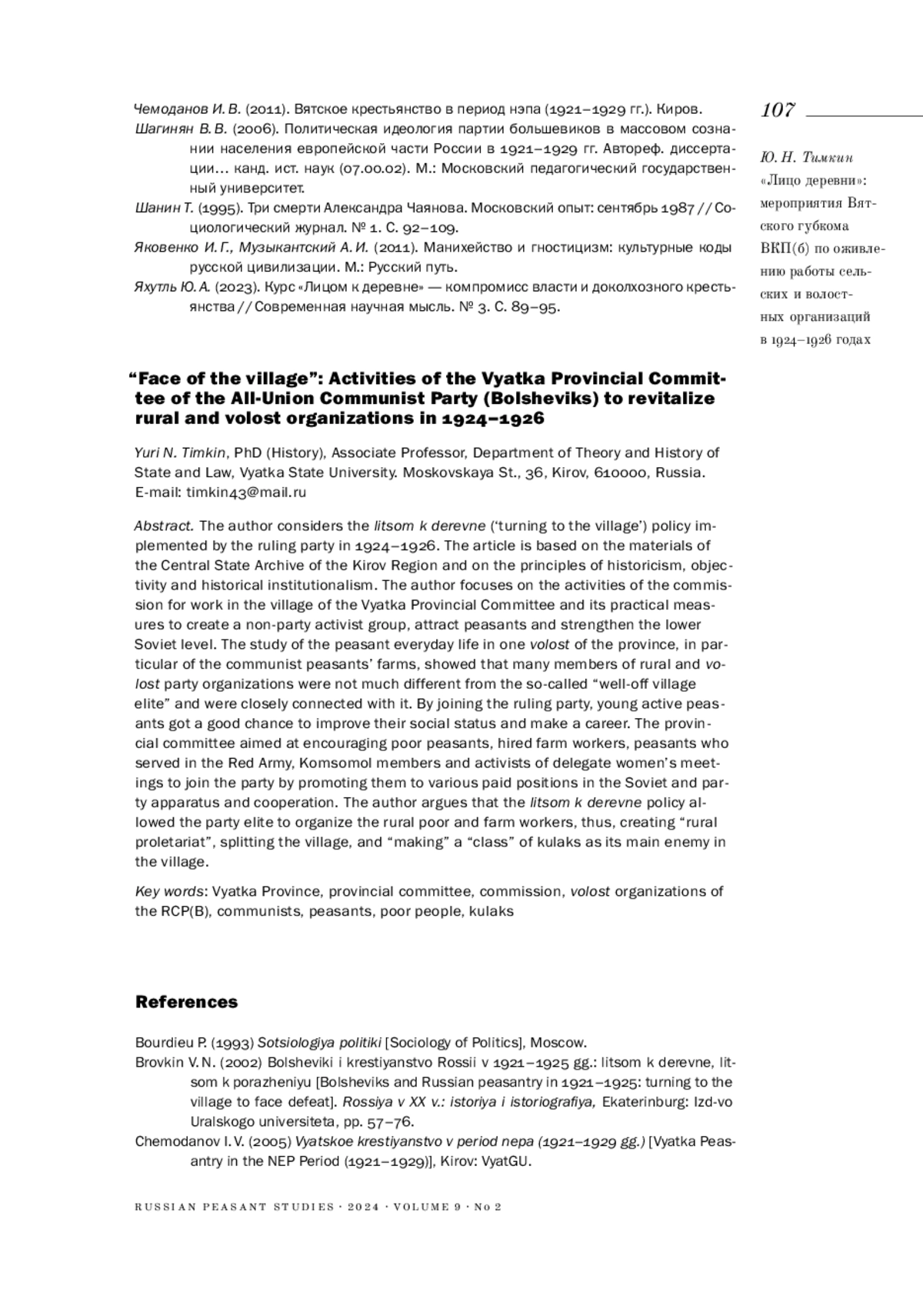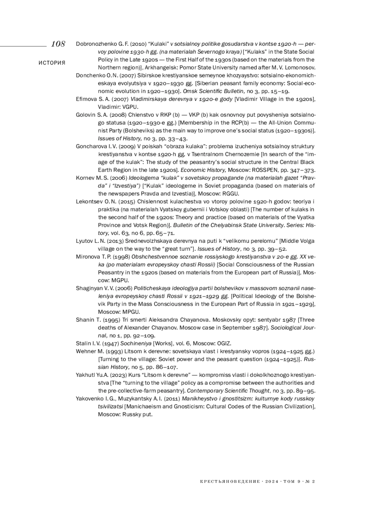 19. 	Яхутль Ю. А. (2023). Курс “Лицом к деревне” - компромисс власти и доколхозного крестьянства // Современная научная мысль. № 3. С. 89-95.  EDN: AQOJSK