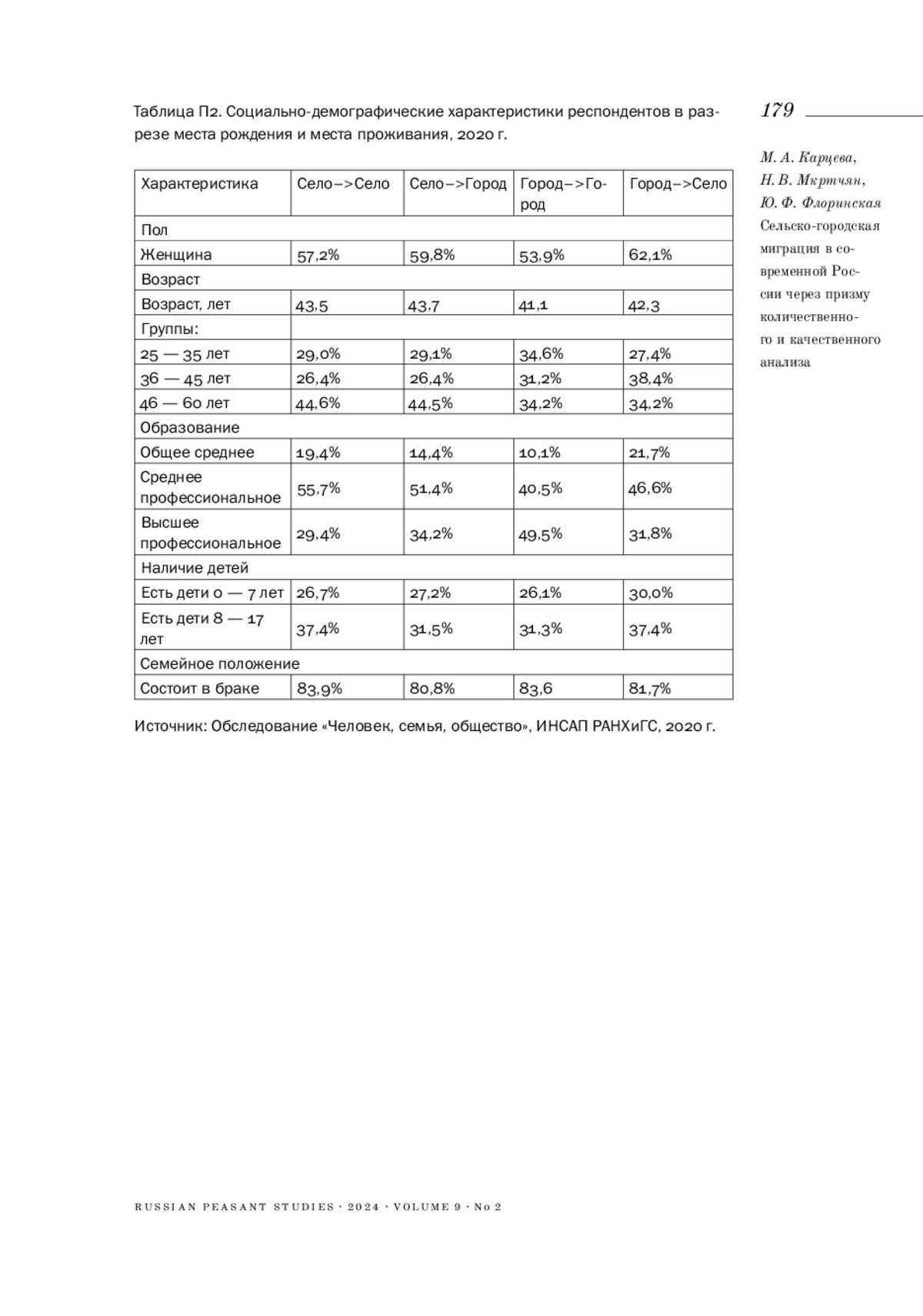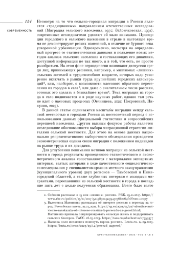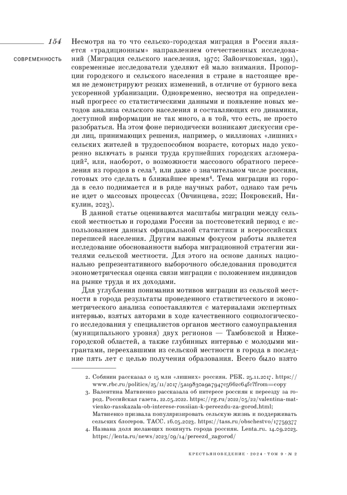 Несмотря на то что сельско-городская миграция в России является «традиционным» направлением отечественных исследований (Миграция сельского населения, 1970; Зайончковская, 1991), современные исследователи уделяют ей мало внимания. Пропорции городского и сельского населения в стране в настоящее время не демонстрируют резких изменений, в отличие от бурного века ускоренной урбанизации. Одновременно, несмотря на определенный прогресс со статистическими данными и появление новых методов анализа сельского населения и составляющих его динамики, доступной информации не так много, а в той, что есть, не просто разобраться. На этом фоне периодически возникают дискуссии среди лиц, принимающих решения, например, о миллионах «лишних» сельских жителей в трудоспособном возрасте, которых надо ускоренно включать в рынки труда крупнейших городских агломераций2, или, наоборот, о возможности массового обратного переселения из городов в села3, или даже о значительном числе россиян, готовых это сделать в ближайшее время4. Тема миграции из города в село поднимается и в ряде научных работ, однако там речь не идет о массовых процессах (Овчинцева, 2022; Покровский, Никулин, 2023).