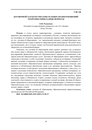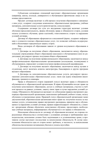 Отмечено, что договор об образовании имеет важное значение для: установления четких прав и обязанностей сторон; обеспечения правовой защиты обучающихся; регулирования финансовых аспектов образовательного процесса; установления стандартов качества образовательных услуг. Договор об образовании имеет определённую структуры и включает в себя следующие элементы: субъектов договорных отношений, предмет договора, содержание договора, форма договора. Субъектами договорных отношений выступают образовательные организации (например, школа, колледж, университет) и обучающиеся (физические лица) и их законные представители. Предмет договора включает в себя процесс получения образования и связанных с ним услуг, содержит следующие компоненты: образовательные программы, учебные материалы, дополнительные услуги (репетиторство, консультации). Содержание договора (по сути его внутренняя структура) включает условия обучения (продолжительность, форма обучения), права и обязанности сторон, условия оплаты (стоимость обучения, сроки платежей), ответственность сторон за нарушение условий договора. Договор об образовании оформляется в письменной форме, содержит информацию о стоимости платных образовательных услуг, что позволяет избежать недоразумений и обеспечивает юридическую защиту сторон.