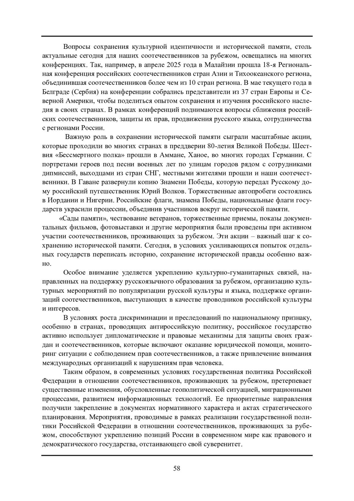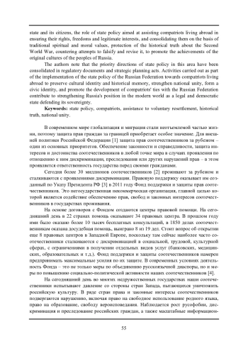 Авторы отмечают, что приоритетные направления государственной политики в этой сфере получили закрепление в документах нормативного характера и актах стратегического планирования. Мероприятия, проводимые в рамках реализации государственной политики Российской Федерации в отношении соотечественников, проживающих за рубежом, по сохранению культурной идентичности и исторической памяти, укреплению национального единства, формированию гражданской идентичности, содействию развития связей соотечественников с Российской Федерацией способствуют укреплению позиций России в современном мире как правового и демократического государства, отстаивающего свой суверенитет.