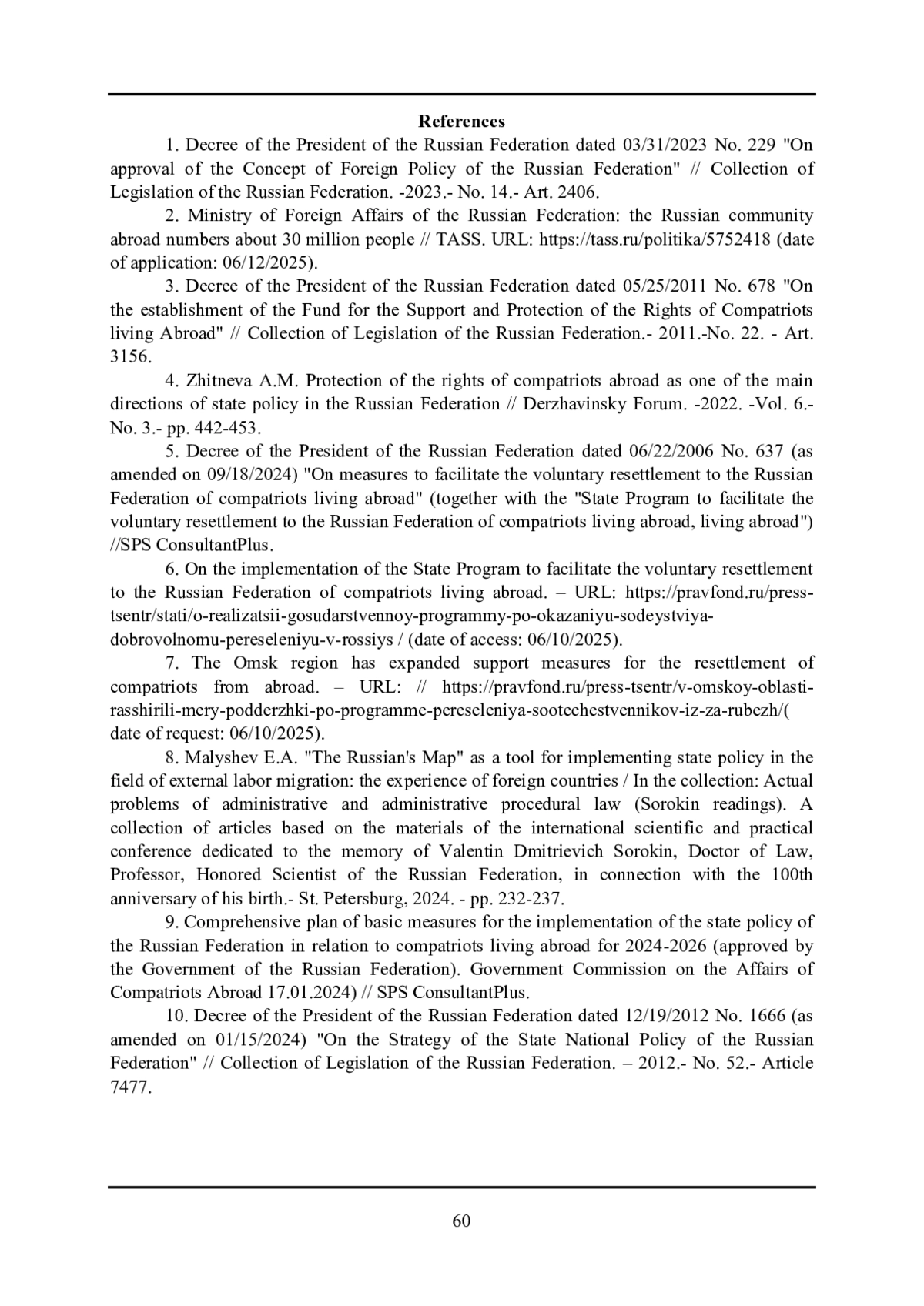 4. Житнева А.М. Защита прав соотечественников за рубежом как одно из основных направлений государственной политики в Российской Федерации // Державинский форум. - 2022. - Т. 6. - № 3. - С. 442-453.