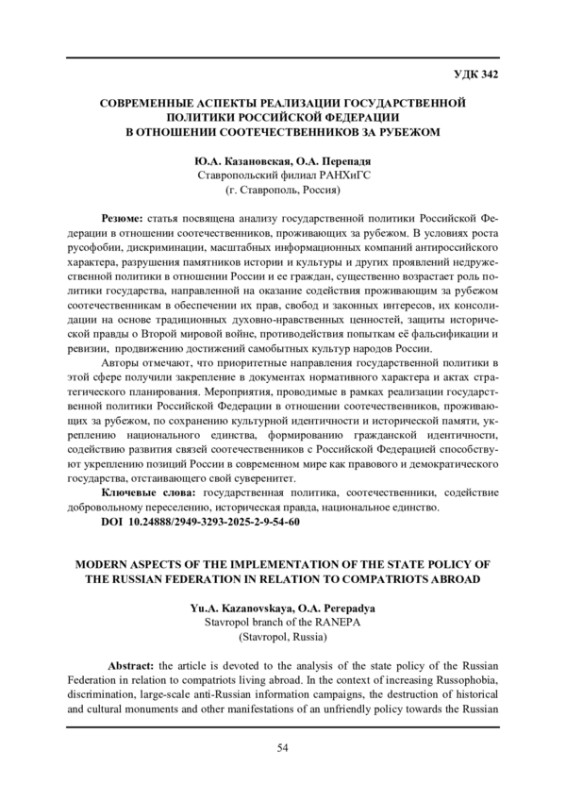 Статья посвящена анализу государственной политики Российской Федерации в отношении соотечественников, проживающих за рубежом. В условиях роста русофобии, дискриминации, масштабных информационных компаний антироссийского характера, разрушения памятников истории и культуры и других проявлений недружественной политики в отношении России и ее граждан, существенно возрастает роль политики государства, направленной на оказание содействия проживающим за рубежом соотечественникам в обеспечении их прав, свобод и законных интересов, их консолидации на основе традиционных духовно-нравственных ценностей, защиты исторической правды о Второй мировой войне, противодействия попыткам её фальсификации и ревизии, продвижению достижений самобытных культур народов России.