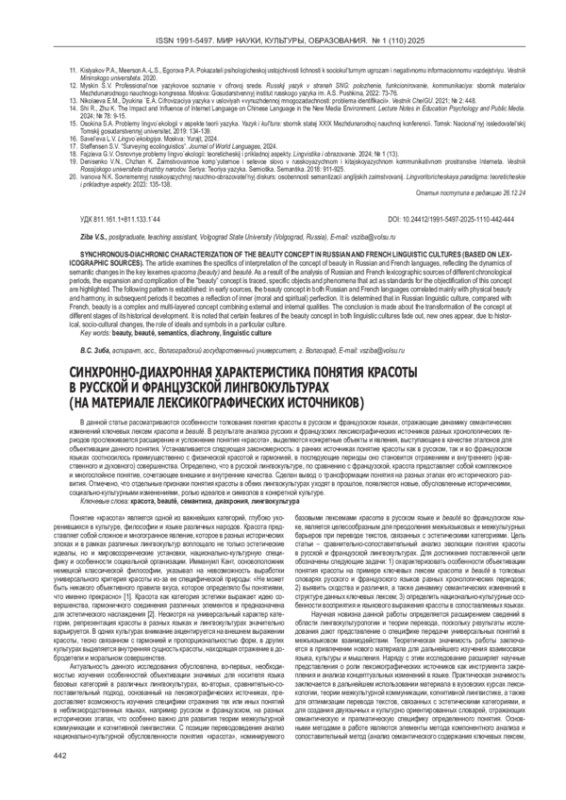 2. Зиба В.С. Некоторые особенности перевода универсального понятия красота в текстах художественной литературы (на материале русского и французского языков). Материалы VIII Международной научно-практической конференции. Симферополь: Ариал, 2024: 135-138. EDN: IFMARW