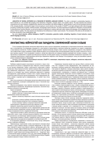 Статья посвящена обоснованию лингвистики нейросетей как нового научного направления, возникающего на пересечении лингвистики, компьютерных наук и когнитивистики. В исследовании описываются и сопоставляются компьютерная и корпусная лингвистики, выделяются их задачи и взаимосвязь с искусственным интеллектом. Особое внимание уделяется терминологическому аппарату нового научного направления, исследуются этапы обработки текста нейросетями и задачи, решаемые в рамках обработки данных на естественном языке, включая выделение сущностей, анализ тональности и построение языковых моделей. Статья подчеркивает значимость лингвистики нейросетей для совершенствования взаимодействия человека и машины, а также перспективы ее применения в создании мультимодальных моделей, изучении редких языков и исследовании механизмов человеческого мышления. В исследовании представлены и охарактеризованы архитектуры современных нейронных сетей. Выводы статьи формируют основу для дальнейшего развития данного междисциплинарного направления.