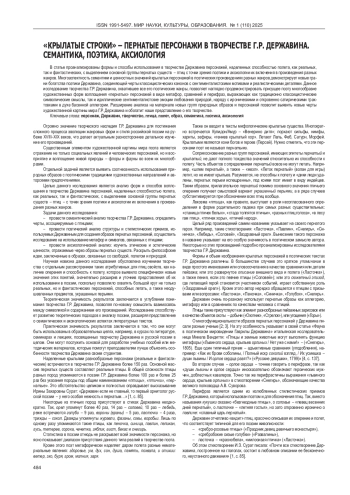 В статье проанализированы формы и способы использования в творчестве Державина персонажей, наделенных способностью полета, как реальных, так и фантастических, с выделением основной группы пернатых существ - птиц с точки зрения поэтики и аксиологии их включения в произведения разных жанров. Многоаспектность семантики и ценностных значений крылатых персонажей в поэтических произведениях разных жанров демонстрирует новые грани богатства поэтики Державина, соединяющей черты классицистических канонов с сентименталистскими мотивами и реалистическими деталями. Данное исследование творчества ГР Державина, охватившее все его поэтические жанры, позволяет наглядно продемонстрировать присущее поэту многообразие художественных форм воплощения «пернатых» персонажей в виде метафор, сравнений и перифраз, выражающих как традиционно классицистические символические смыслы, так и идиллические сентименталистские эмоции любования природой, наряду с ироническими и откровенно сатирическими трактовками в духе басенной аллегории. Расширение анализа на материале новых групп природных образов и персонажей позволит выявить новые черты художественной картины мира Г. Р. Державина и обогатит наше представление о его творчестве.
