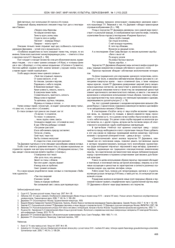 Огромно значение творческого наследия Г. Р. Державина для постижения сложного процесса эволюции жанровых форм и стиля российской поэзии на рубеже XVIII–XIX веков, что делает актуальным разностороннее детальное изучение его произведений.