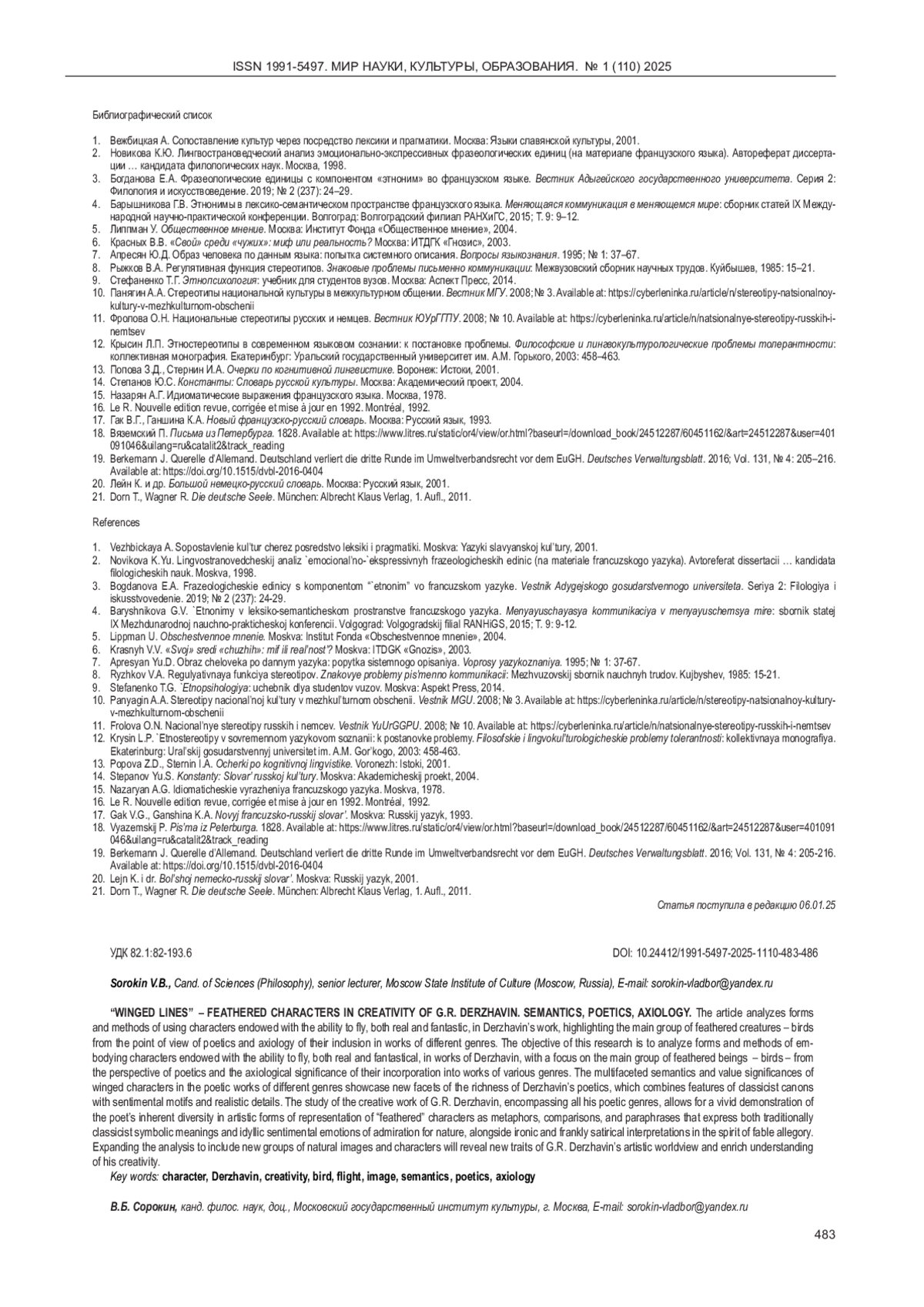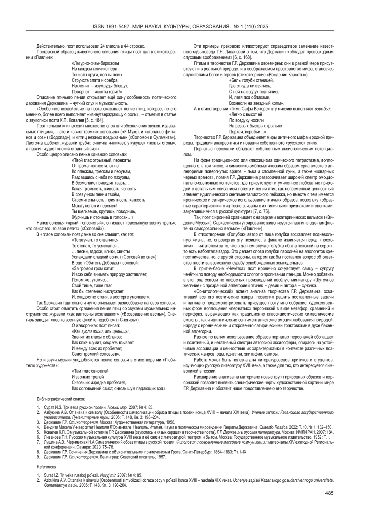 4. 	Вендити Микела Университет Неаполя Л’Ориентале, Неаполь, Италия. Фауна в поэтическом мировидении Гаврилы Державина. Quaestio Rossica. 2022; Т 10, № 1: 132-150. EDN: EWAPFU