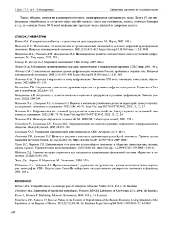 8. Магомедова Р.Н. Направления развития инструментов маркетинга в условиях цифровизации рынков. Маркетинг в России и за рубежом. 2022;6:44-50.