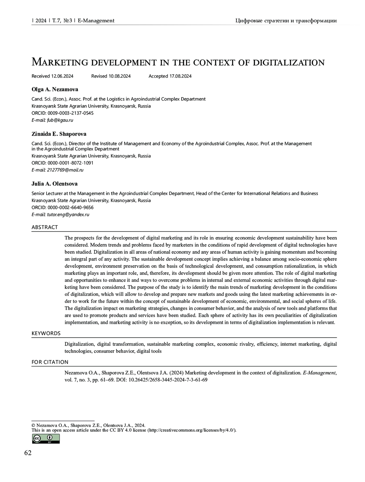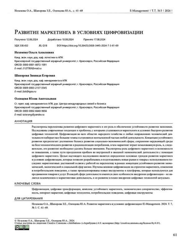 Рассмотрены перспективы развития цифрового маркетинга и его роль в обеспечении устойчивости развития экономики. Исследованы современные тенденции и проблемы, с которыми сталкиваются маркетологи в условиях быстрого развития цифровых технологий. Цифровизация во всех областях народного хозяйства и любых направлениях человеческой деятельности набирает все большие темпы и становится неотъемлемой частью любой деятельности. Концепция устойчивого развития предполагает достижение баланса развития социально-экономической сферы, сохранения окружающей среды на базе технологического развития и рационализации потребления, в чем маркетинг играет немаловажную роль, и, следовательно, его развитию необходимо уделять больше внимания. Рассмотрены роль цифрового маркетинга и возможности ее повышения, а также пути преодоления проблем во внутренней и внешней экономической деятельности с помощью цифрового маркетинга. Целью настоящего исследования является определение основных трендов развития маркетинга в условиях цифровизации, которые позволят разрабатывать и подготавливать новые рынки и товары с использованием последних маркетинговых достижений в связи с работой на перспективу в рамках концепции устойчивого развития экономической, экологической и социальной сфер жизни. Изучены влияние цифровизации на стратегии маркетинга, изменения в потребительском поведении, а также проанализированы новые инструменты и платформы, которые используются для продвижения товаров и услуг. В каждой сфере деятельности имеются свои особенности внедрения цифровизации – не является исключением и маркетинговая деятельность, и ее развитие в плане внедрения цифровых технологий актуально.