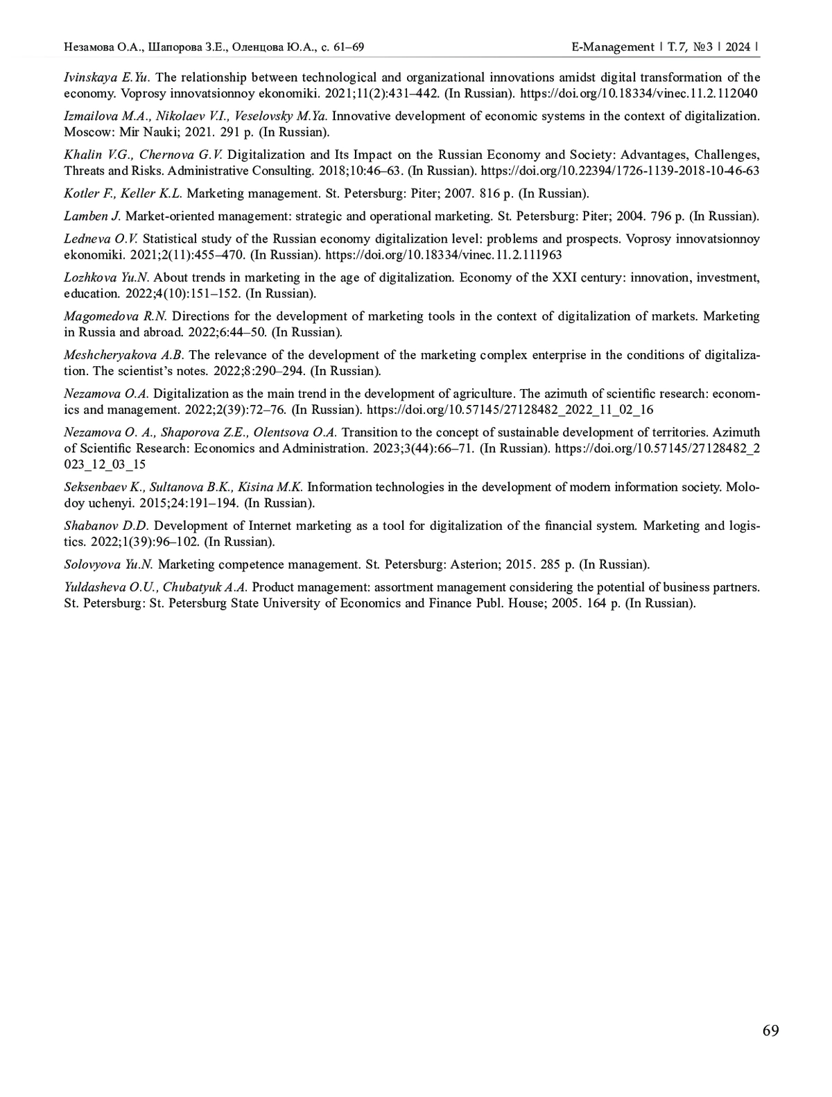 3. Измайлова М.А., Николаев В.И., Веселовский М.Я. Инновационное развитие экономических систем в условиях цифровизации. М.: Мир науки; 2021. 291 с.
