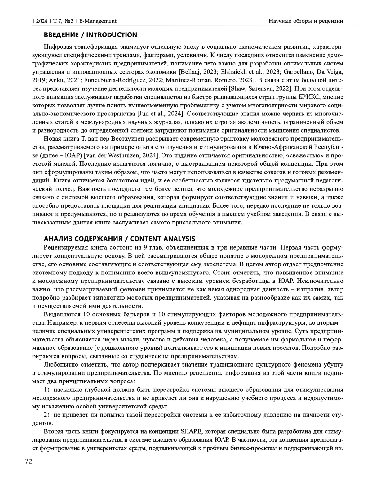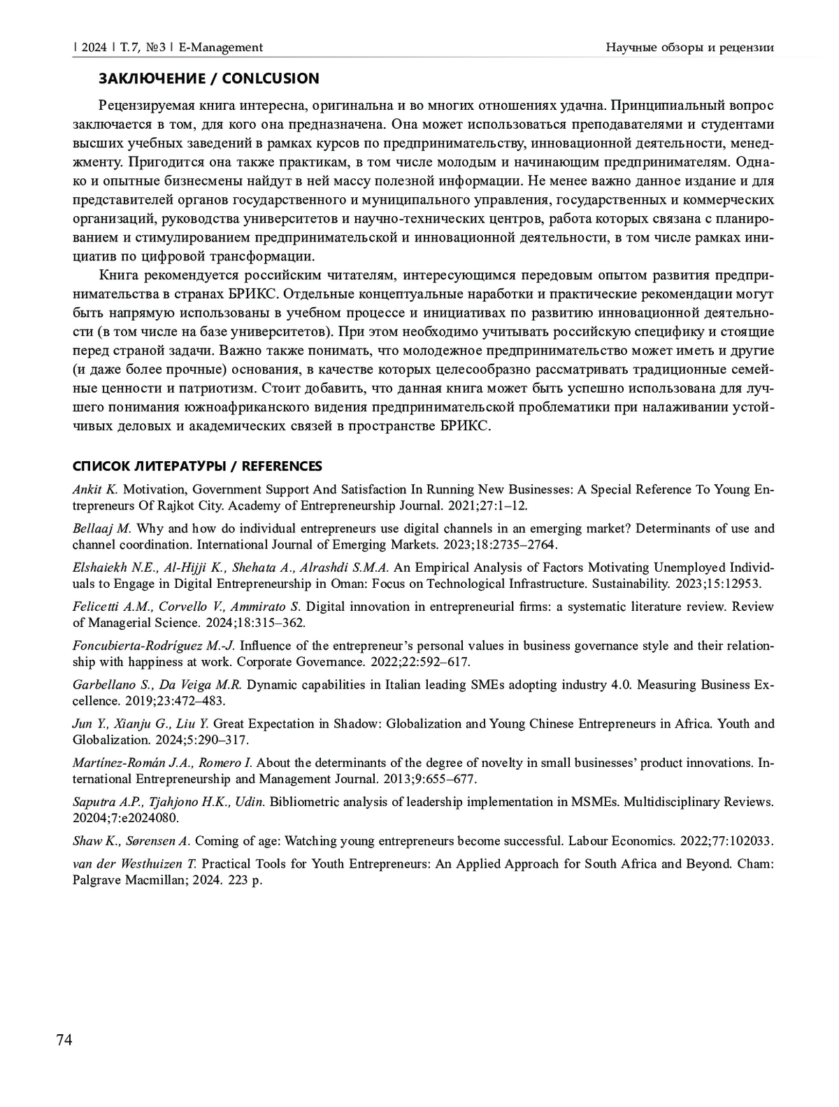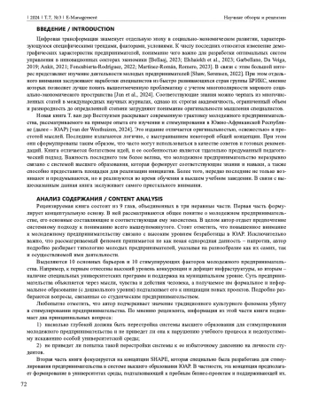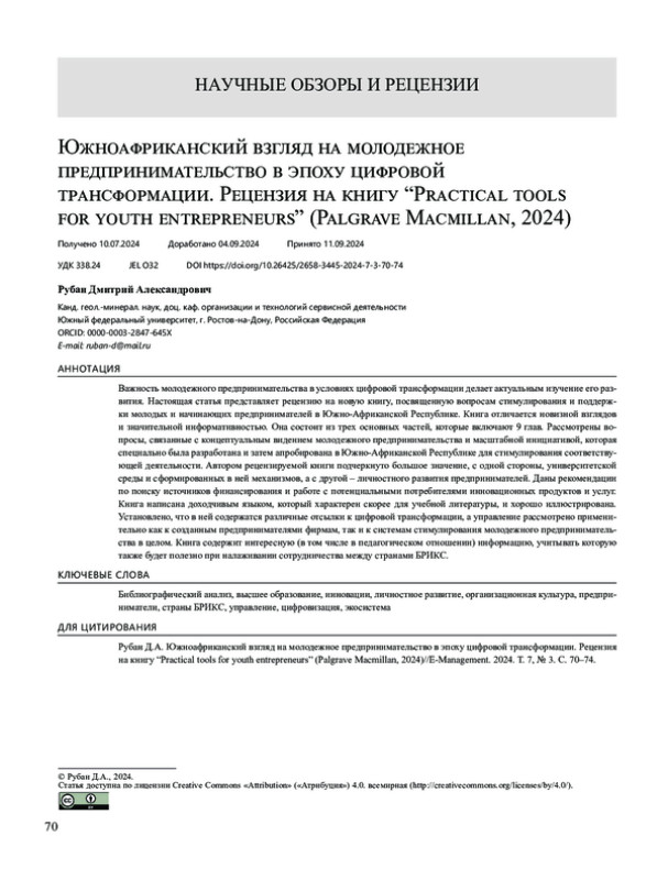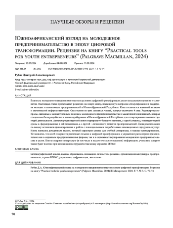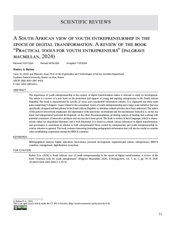 Важность молодежного предпринимательства в условиях цифровой трансформации делает актуальным изучение его развития. Настоящая статья представляет рецензию на новую книгу, посвященную вопросам стимулирования и поддержки молодых и начинающих предпринимателей в Южно-Африканской Республике. Книга отличается новизной взглядов и значительной информативностью. Она состоит из трех основных частей, которые включают 9 глав. Рассмотрены вопросы, связанные с концептуальным видением молодежного предпринимательства и масштабной инициативой, которая специально была разработана и затем апробирована в Южно-Африканской Республике для стимулирования соответствующей деятельности. Автором рецензируемой книги подчеркнуто большое значение, с одной стороны, университетской среды и сформированных в ней механизмов, а с другой – личностного развития предпринимателей. Даны рекомендации по поиску источников финансирования и работе с потенциальными потребителями инновационных продуктов и услуг. Книга написана доходчивым языком, который характерен скорее для учебной литературы, и хорошо иллюстрирована. Установлено, что в ней содержатся различные отсылки к цифровой трансформации, а управление рассмотрено применительно как к созданным предпринимателями фирмам, так и к системам стимулирования молодежного предпринимательства в целом. Книга содержит интересную (в том числе в педагогическом отношении) информацию, учитывать которую также будет полезно при налаживании сотрудничества между странами БРИКС.