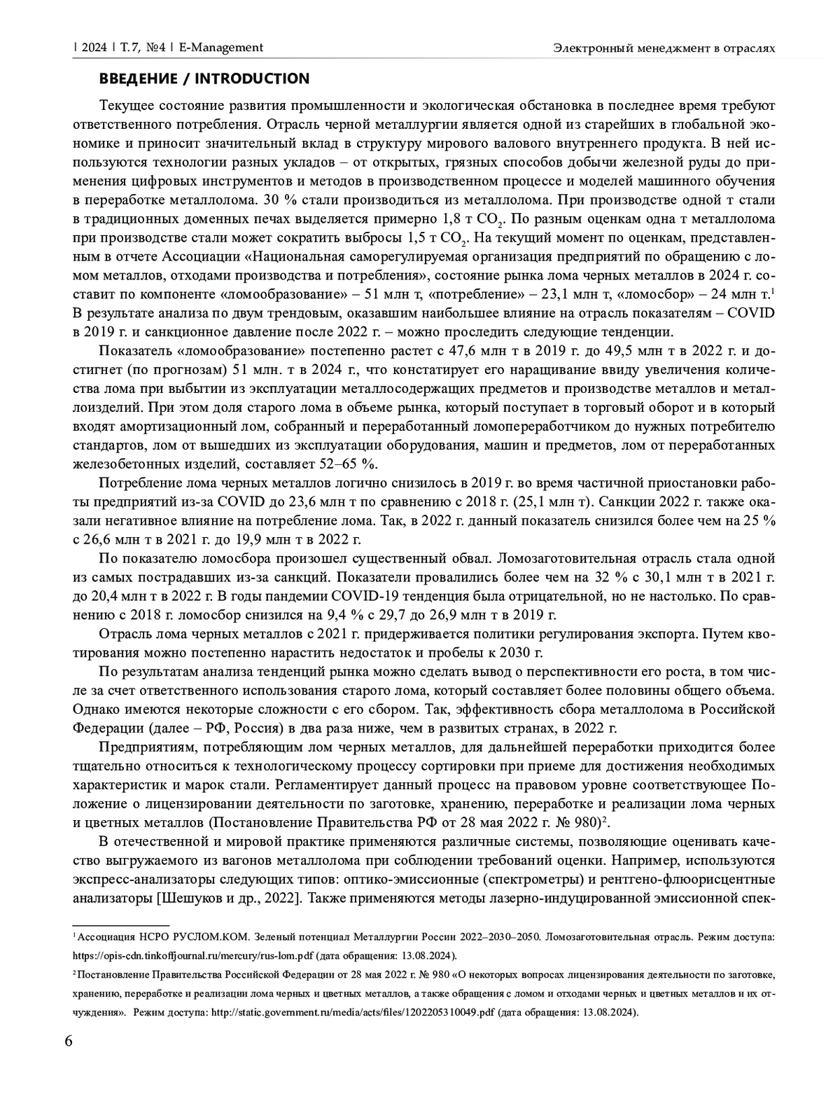В настоящее время в отрасли черной металлургии наблюдаются растущие тенденции по показателю «ломообразование», что требует более ответственного отношения и эффективных способов в последующих переделах производственной цепочки. Приведены прогнозы развития рынка лома черных металлов в перспективе до 2030 г. Представлены факты о возрастающих тенденциях применения машинного зрения в промышленном секторе в результате проведения кластеризации ключевых слов «машинное зрение и промышленность» на основе публикаций, размещенных в базе данных NCBI PubMed. Объект исследования – предприятия металлургической отрасли, в частности по ломозаготовке черных металлов. Предмет исследования – процесс оценки засоренности лома. Проведено сравнение традиционного процесса оценки лома и цифрового (на основе применения машинного зрения), которые визуализированы в виде алгоритмов последовательности шагов их реализации. Подтверждена гипотеза о более эффективном использовании технологии машинного зрения в технологическом производственном процессе оценки засоренности металлолома при его приеме для дальнейшего передела по сравнению с технологией, основанной на визуально-экспертной оценке. Представлены перспективы использования и коммерциализации цифрового сервиса, а также его влияние на прозрачность и надежность взаимодействия между контрагентами. Использовались такие научные методы, как библиометрический анализ литературы, посвященный вопросам применяемых методов и способов оценки качества выгружаемого лома, сравнительный анализ применяемых процессов оценки засоренности лома на основе рассмотренных алгоритмов, а также методы синтеза, которые обобщают результаты.