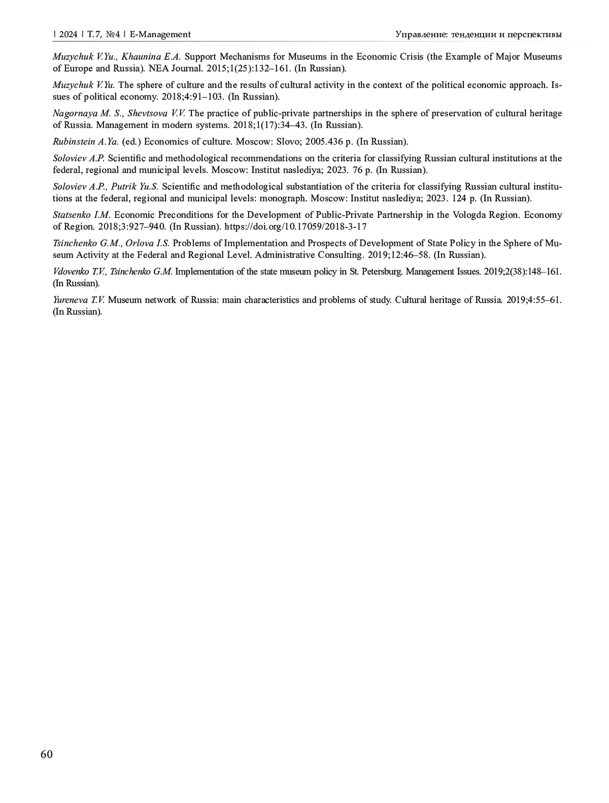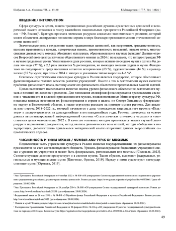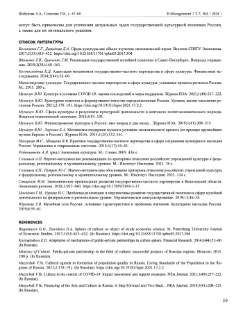 15. Цинченко Г.М., Орлова И.С. Проблемы реализации и перспективы развития государственной политики в сфере музейной деятельности на федеральном и региональном уровне. Управленческое консультирование. 2019;12:46-58.