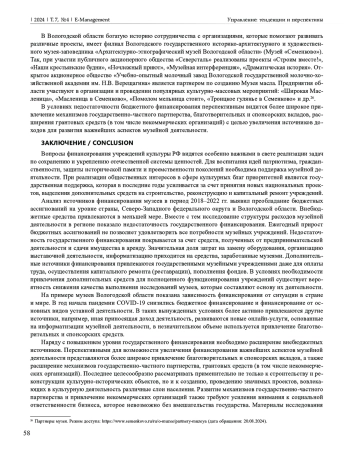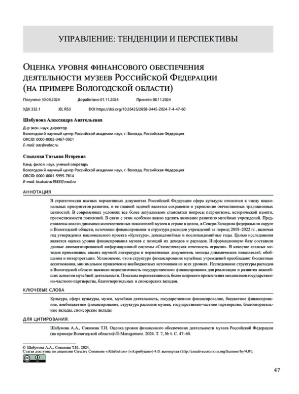 В стратегически важных нормативных документах Российской Федерации сфера культуры относится к числу национальных приоритетов развития, и ее главной задачей является сохранение и укрепление отечественных традиционных ценностей. В современных условиях все более актуальными становятся вопросы патриотизма, исторической памяти, преемственности поколений. В связи с этим особенно важно уделять внимание развитию музейных учреждений. Представлены анализ динамики количественных показателей музеев в стране в целом, в Северо-Западном федеральном округе и Вологодской области, источники финансирования и структура расходов учреждений за период 2018–2022 гг., включая год утверждения национального проекта «Культура», допандемийные и послепандемийные годы. Целью исследования является оценка уровня финансирования музеев с позиций их доходов и расходов. Информационную базу составили данные автоматизированной информационной системы «Статистическая отчетность отрасли». В качестве главных методов применялись анализ научной литературы и нормативных документов, методы динамических показателей, обобщения и интерпретации. Установлено, что в структуре финансирования музейных учреждений преобладают бюджетные ассигнования, минимальное привлечение внебюджетных источников на всех уровнях. Исследование структуры расходов в Вологодской области выявило недостаточность государственного финансирования для реализации и развития важнейших аспектов музейной деятельности. Показана перспективность более широкого привлечения механизмов государственно-частного партнерства, благотворительных и спонсорских вкладов.