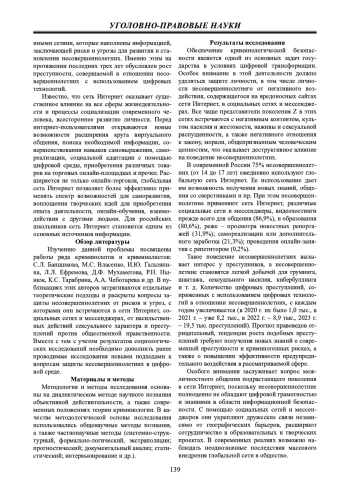 Материалы и методы: материалами исследования послужили: законодательная база, составляющая правовую основу обеспечения криминологической безопасности несовершеннолетних, результаты проведенного социологического исследования, статистические показатели зарегистрированных преступлений, совершаемых в отношении несовершеннолетних с использованием цифровых технологий. В качестве методологического инструментария выступили эмпирический и лингвистический методы познания, научно-аналитический подход, а также специально-юридические методы: социологический, формально-юридический, сравнительно-правовой и др.