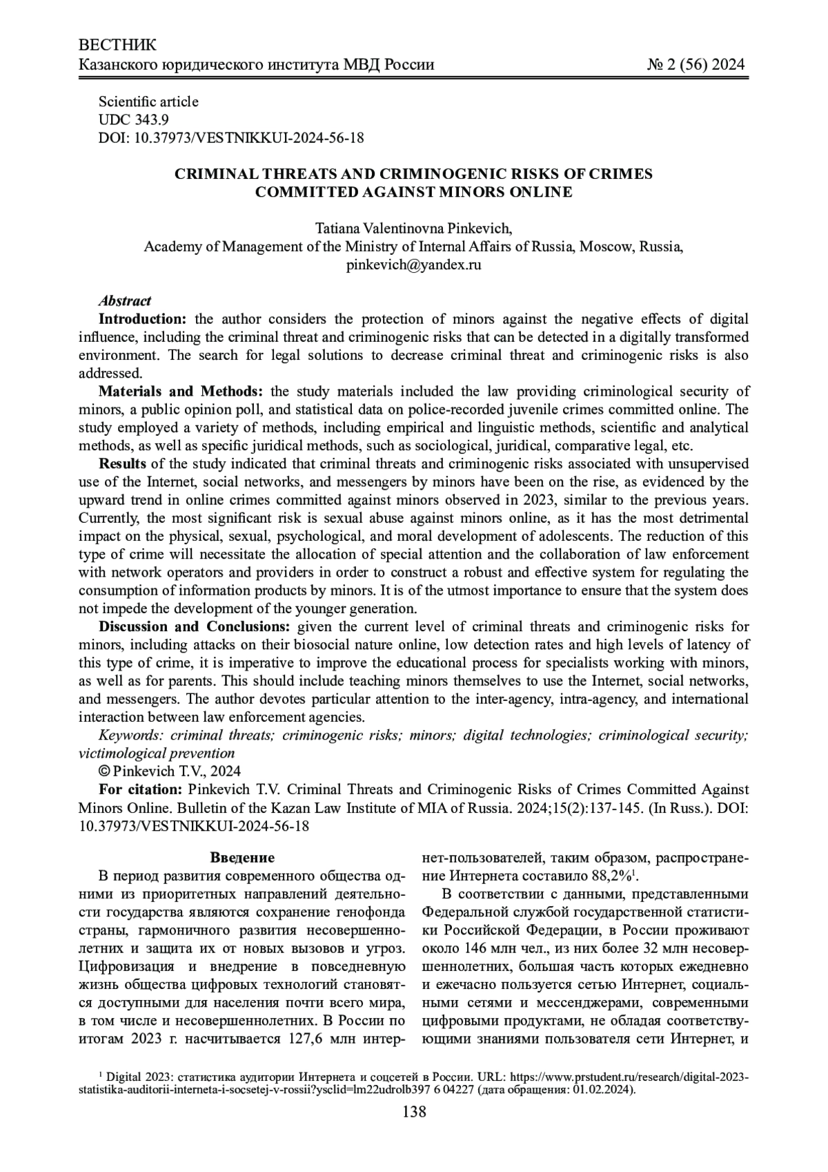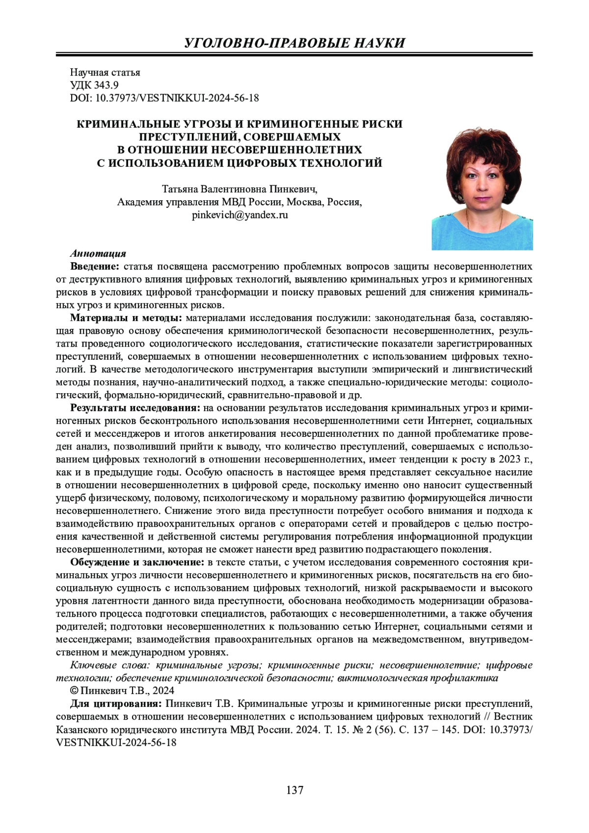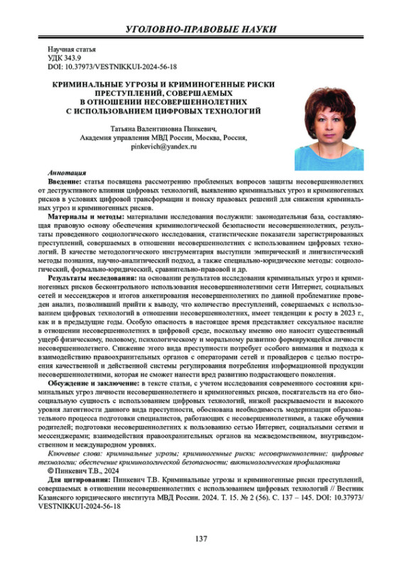 Введение: статья посвящена рассмотрению проблемных вопросов защиты несовершеннолетних от деструктивного влияния цифровых технологий, выявлению криминальных угроз и криминогенных рисков в условиях цифровой трансформации и поиску правовых решений для снижения криминальных угроз и криминогенных рисков.