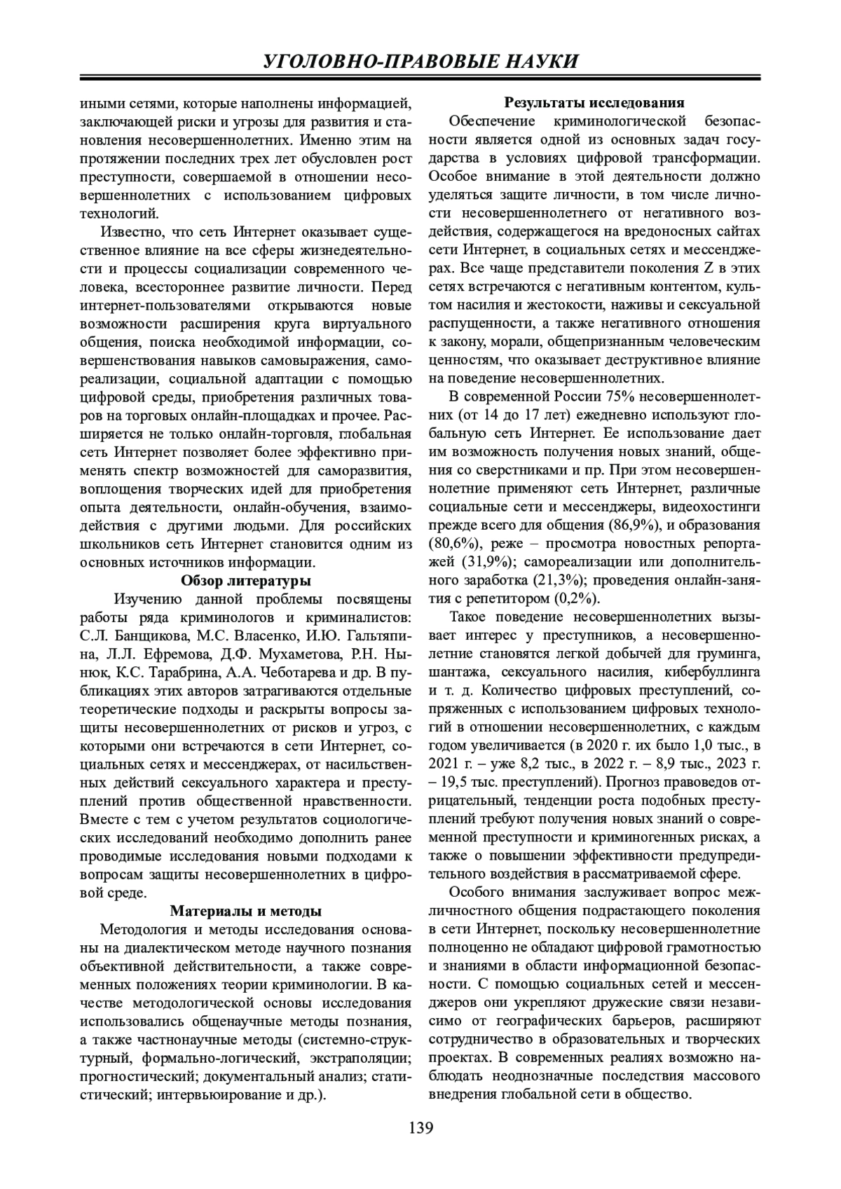 В период развития современного общества одними из приоритетных направлений деятельности государства являются сохранение генофонда страны, гармоничного развития несовершеннолетних и защита их от новых вызовов и угроз. Цифровизация и внедрение в повседневную жизнь общества цифровых технологий становятся доступными для населения почти всего мира, в том числе и несовершеннолетних. В России по итогам 2023 г. насчитывается 127,6 млн интернет-пользователей, таким образом, распространение Интернета составило 88,2%.