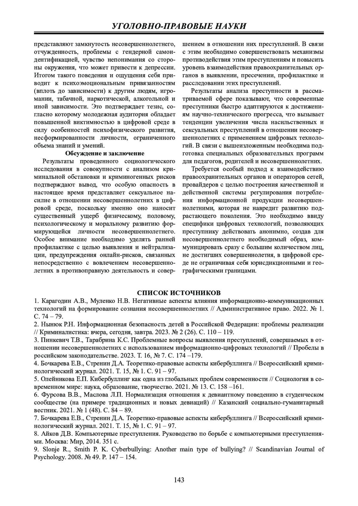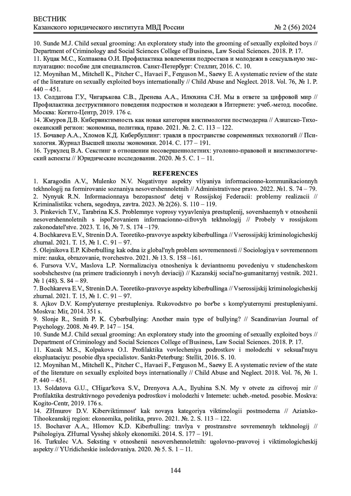 4. 	Бочкарева Е.В., Стренин Д.А. Теоретико-правовые аспекты кибербуллинга // Всероссийский криминологический журнал. 2021. Т. 15, № 1. C. 91 - 97. EDN: ZZGHLR