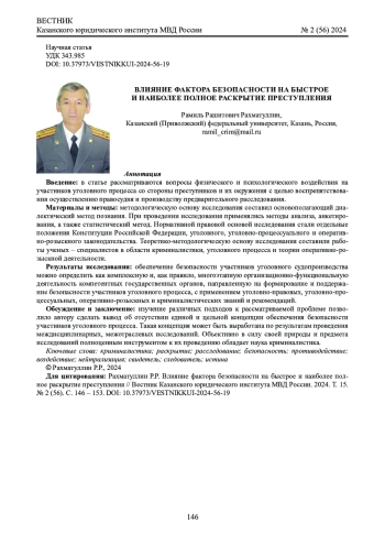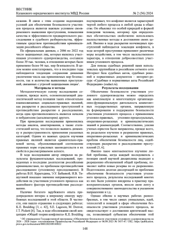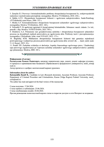 10. 	Богинский М.М. Механизм обеспечения безопасности личности как гарантия нейтрализации противоправного воздействия процессу производства по уголовному делу: автореф. дис. … канд. юрид. наук: 5.1.4. Казань, 2023. 24 с. EDN: NFWDTA