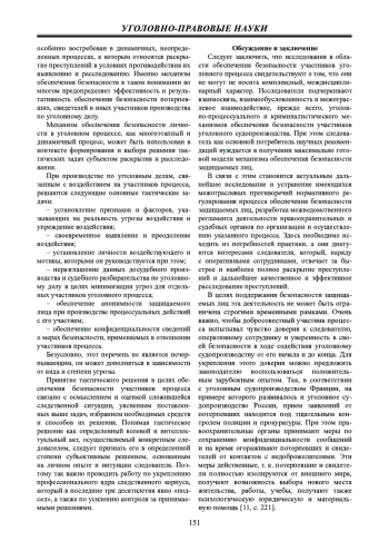 Результаты исследования: обеспечение безопасности участников уголовного судопроизводства можно определить как комплексную и, как правило, многоэтапную организационно-функциональную деятельность компетентных государственных органов, направленную на формирование и поддержание безопасности участников уголовного процесса, с применением уголовно-правовых, уголовно-процессуальных, оперативно-розыскных и криминалистических знаний и рекомендаций.