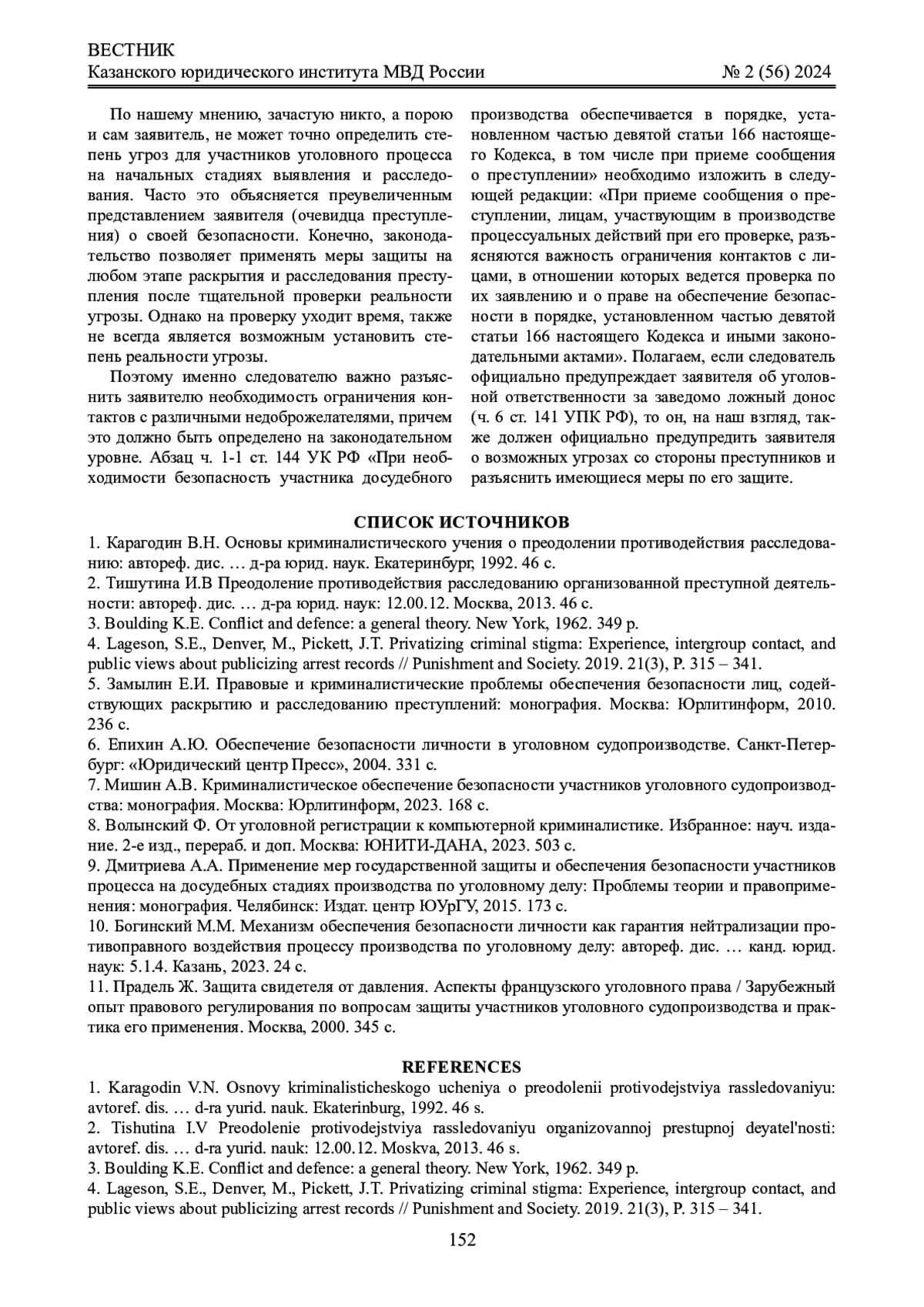 5. 	Замылин Е.И. Правовые и криминалистические проблемы обеспечения безопасности лиц, содействующих раскрытию и расследованию преступлений: монография. Москва: Юрлитинформ, 2010. 236 с. EDN: QRSRWJ
