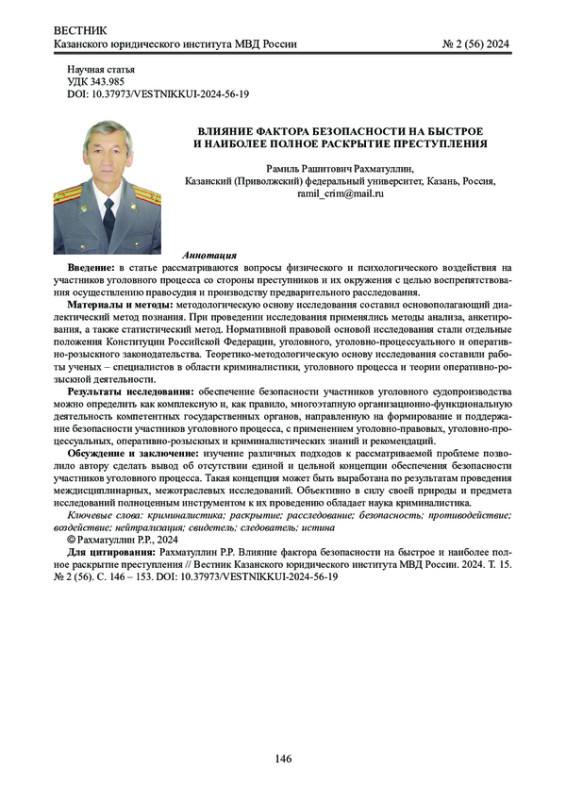 Обсуждение и заключение: изучение различных подходов к рассматриваемой проблеме позволило автору сделать вывод об отсутствии единой и цельной концепции обеспечения безопасности участников уголовного процесса. Такая концепция может быть выработана по результатам проведения междисциплинарных, межотраслевых исследований. Объективно в силу своей природы и предмета исследований полноценным инструментом к их проведению обладает наука криминалистика.
