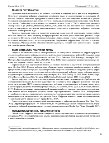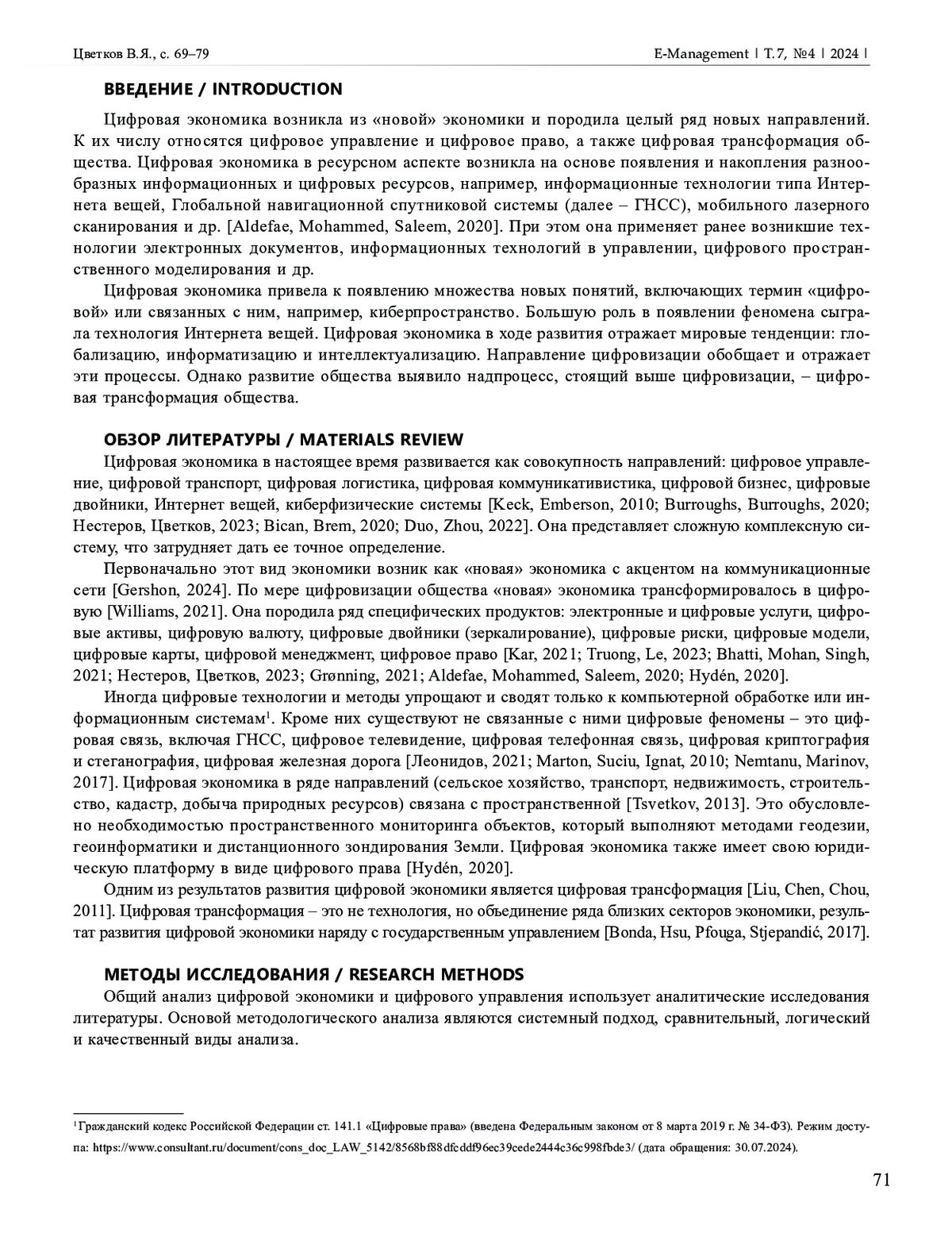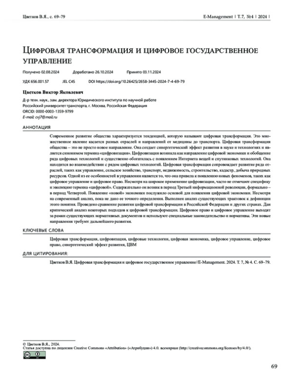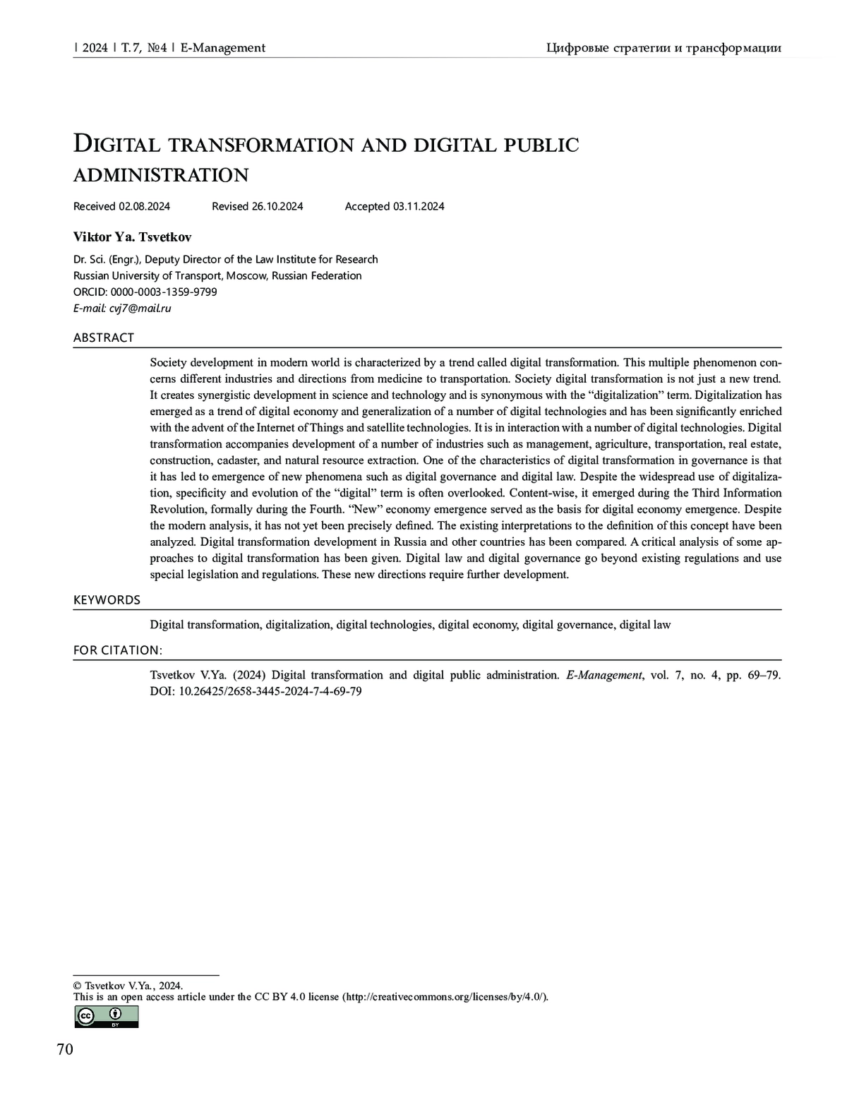 Современное развитие общества характеризуется тенденцией, которую называют цифровая трансформация. Это множественное явление касается разных отраслей и направлений от медицины до транспорта. Цифровая трансформация общества – это не просто новое направление. Она создает синергетический эффект развития в науке и технологиях и является синонимом термина «цифровизация». Цифровизация возникла как направление цифровой экономики и обобщение ряда цифровых технологий и существенно обогатилась с появлением Интернета вещей и спутниковых технологий. Она находится во взаимодействии с рядом цифровых технологий. Цифровая трансформация сопровождает развитие ряда отраслей, таких как управление, сельское хозяйство, транспорт, недвижимость, строительство, кадастр, добыча природных ресурсов. Одной из ее особенностей в управлении является то, что она привела к появлению новых феноменов, таких как цифровое управление и цифровое право. Несмотря на широкое применение цифровизации, часто не отмечают специфику и эволюцию термина «цифровой». Содержательно он возник в период Третьей информационной революции, формально – в период Четвертой. Появление «новой» экономики послужило основой для появления цифровой экономики. Несмотря на современный анализ, пока не дано ее точного определения. Выполнен анализ существующих трактовок к дефиниции этого понятия. Проведено сравнение развития цифровой трансформации в Российской Федерации и других странах. Дан критический анализ некоторых подходов к цифровой трансформации. Цифровое право и цифровое управление выходят за рамки существующих нормативных документов и используют специальные законодательство и нормативы. Эти новые направления требуют дальнейшего развития.