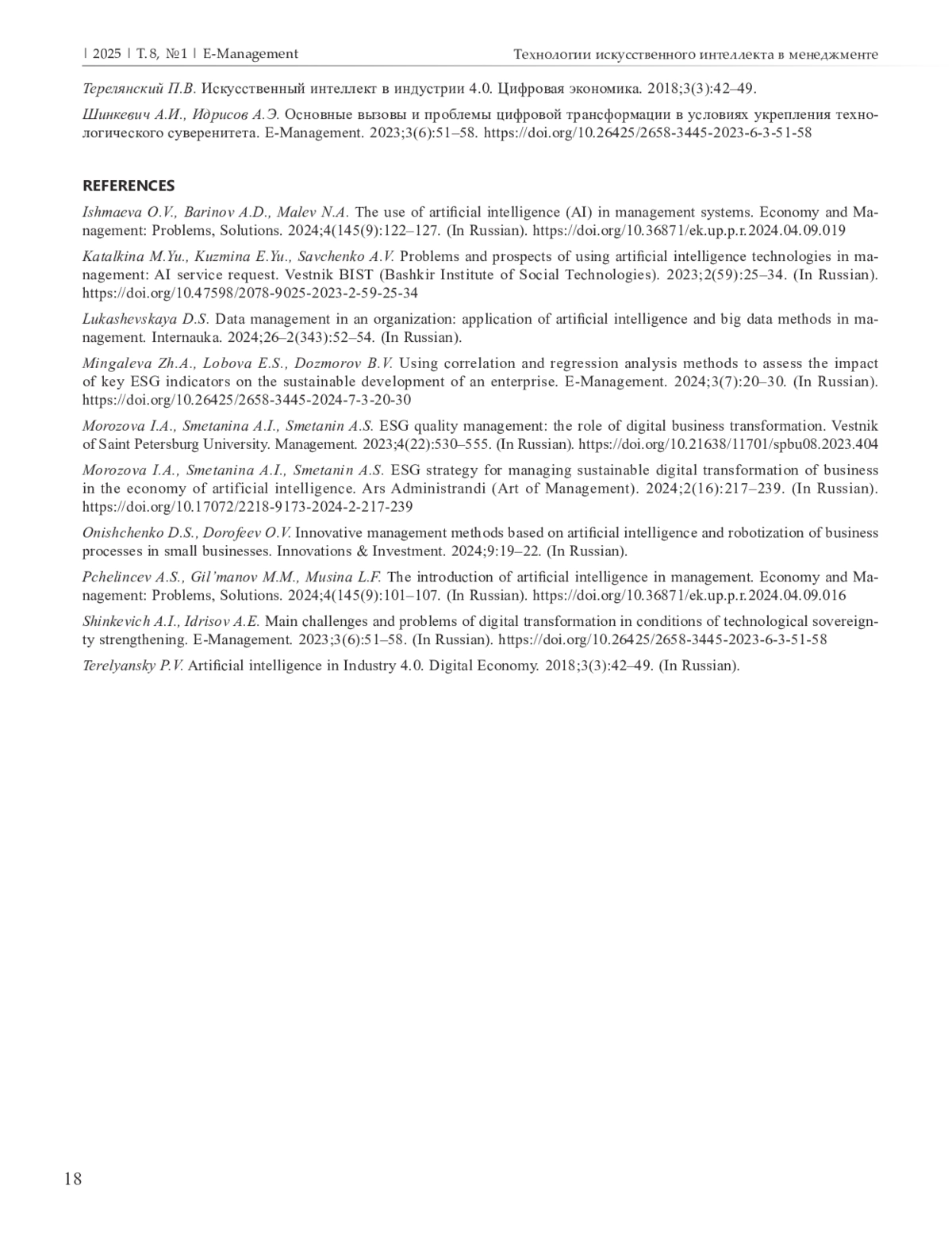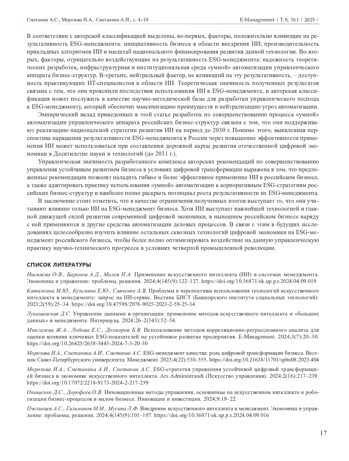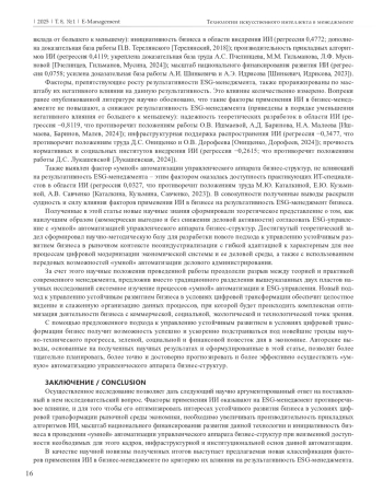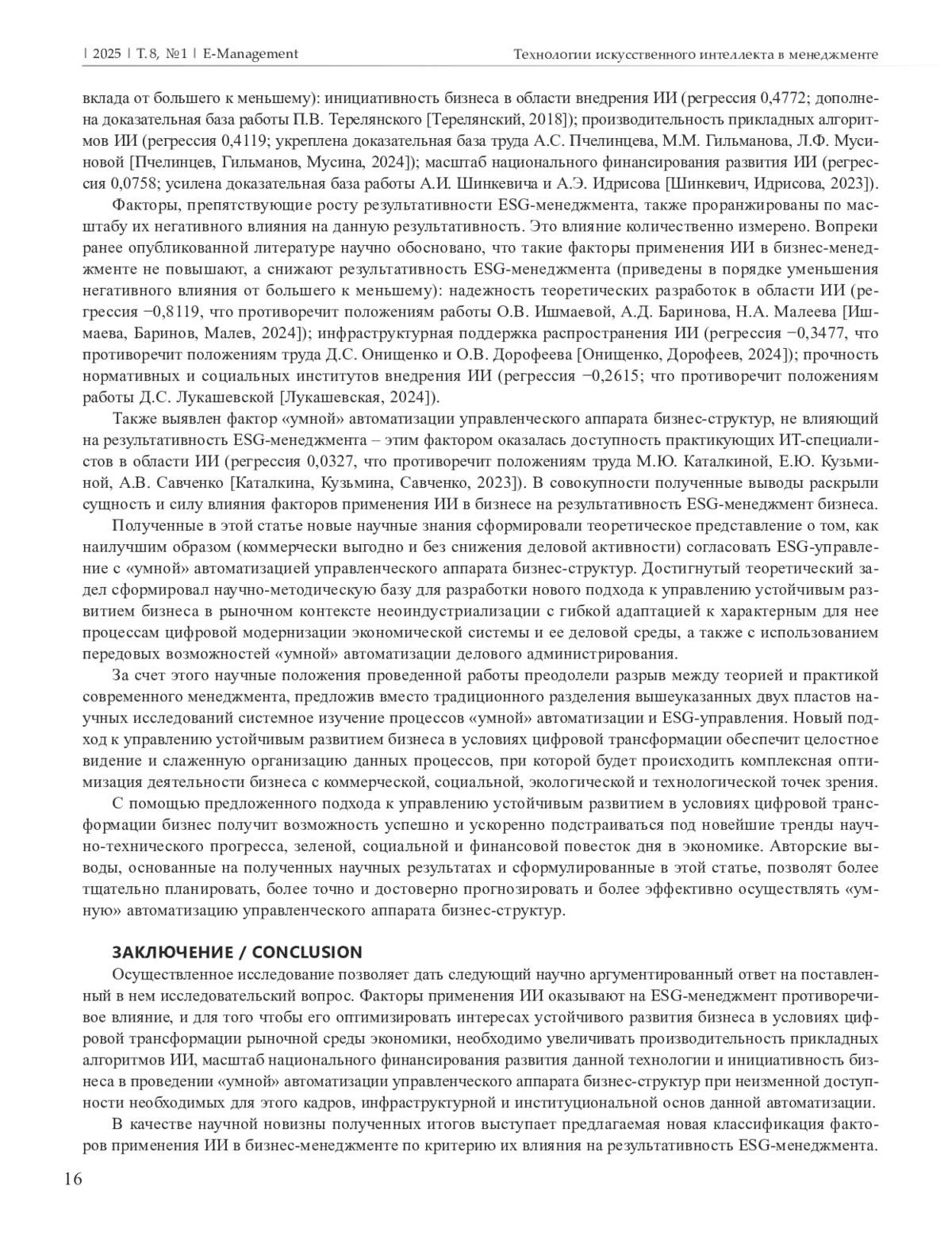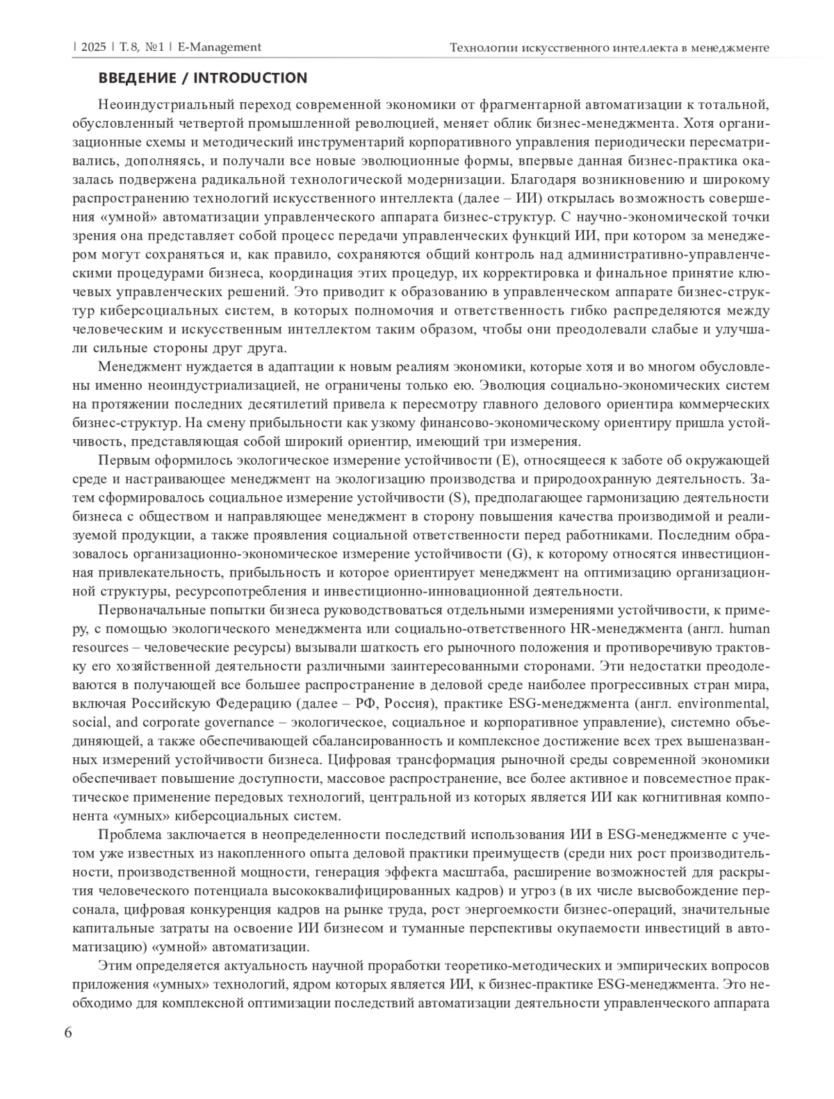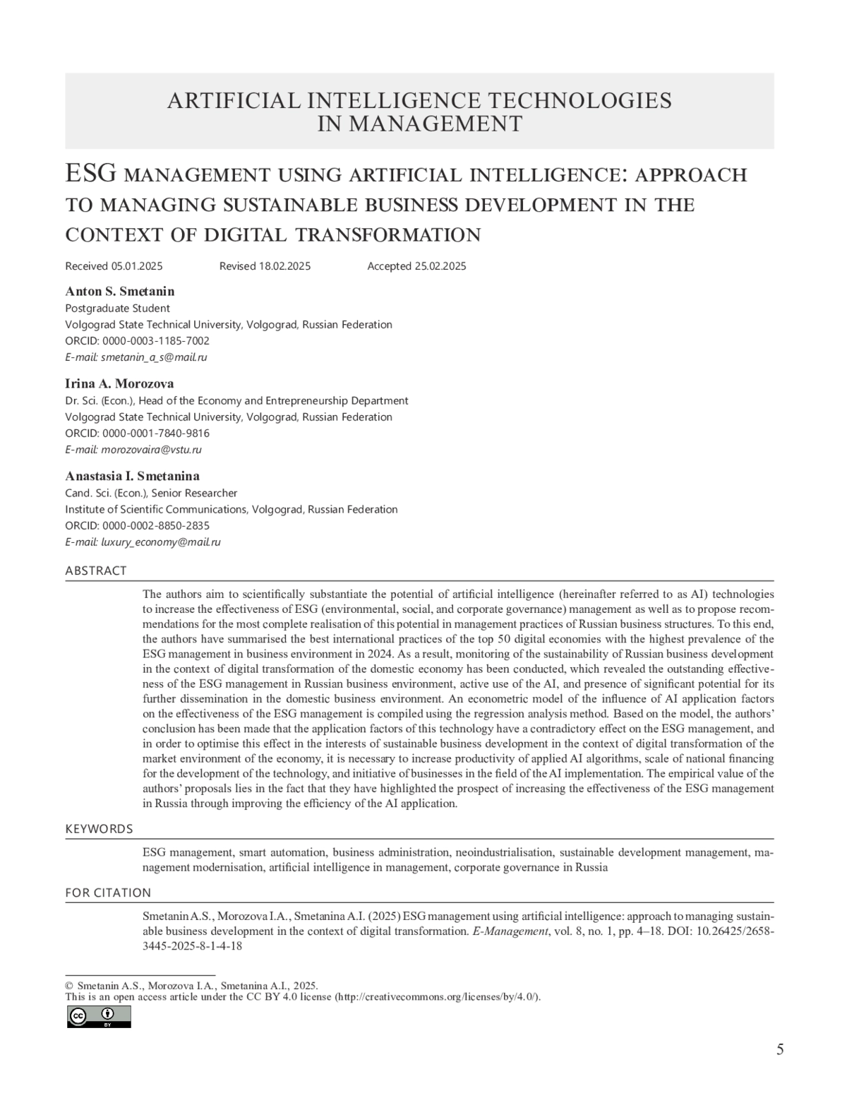 Авторы преследуют цели научного обоснования наличия у технологий искусственного интеллекта (далее – ИИ) потенциала наращения результативности ESG-менеджмента (англ. environmental, social, and corporate governance – экологическое, социальное и корпоративное управление), а также предложения рекомендаций для наиболее полной реализации этого потенциала в управленческой практике российских бизнес-структур. Для этого авторами обобщен передовой международный опыт топ-50 цифровых экономик с наибольшей распространенностью ESG-менеджмента в деловой среде в 2024 г. В итоге проведен мониторинг устойчивости развития российского бизнеса в условиях цифровой трансформации отечественной экономики, выявивший выдающуюся результативность ESG-менеджмента в деловой среде Российской Федерации (далее – РФ), активное использование ИИ и наличие значительного потенциала его дальнейшего распространения в отечественной деловой среде. Методом регрессионного анализа составлена эконометрическая модель влияния факторов применения ИИ на результативность ESG-менеджмента. С опорой на модель сделан авторский вывод о том, что факторы применения этой технологии оказывают на ESG-менеджмент противоречивое влияние, и для того чтобы оптимизировать последнее в интересах устойчивого развития бизнеса в условиях цифровой трансформации рыночной среды экономики, необходимо увеличивать производительность прикладных алгоритмов ИИ, масштаб национального финансирования развития технологии и стимулировать инициативность бизнеса в области внедрения ИИ. Эмпирическая ценность авторских предложений заключена в том, что они высветили перспективу наращения результативности ESG-менеджмента в РФ через повышение эффективности применения ИИ.
