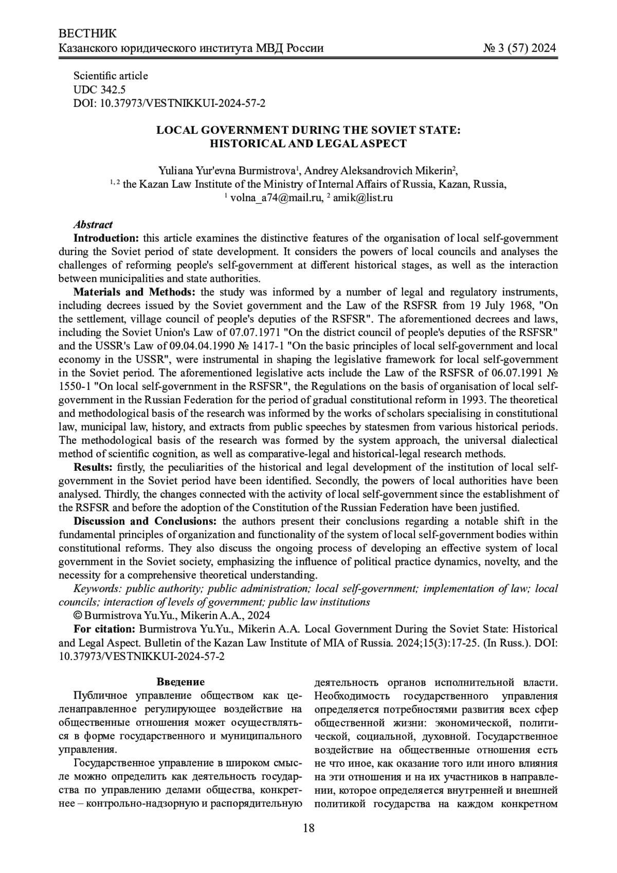 Введение: в статье рассматриваются особенности организации местного самоуправления в советский период развития государства, уделяется внимание полномочиям местных советов, анализируются проблемы реформирования самоуправления на различных исторических этапах, трансформация уровней советской государственности.