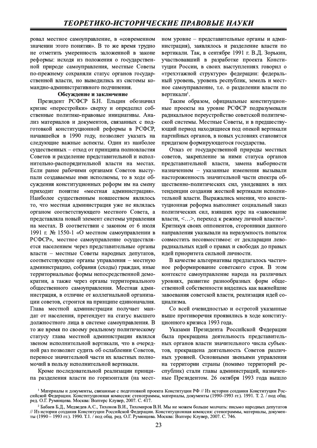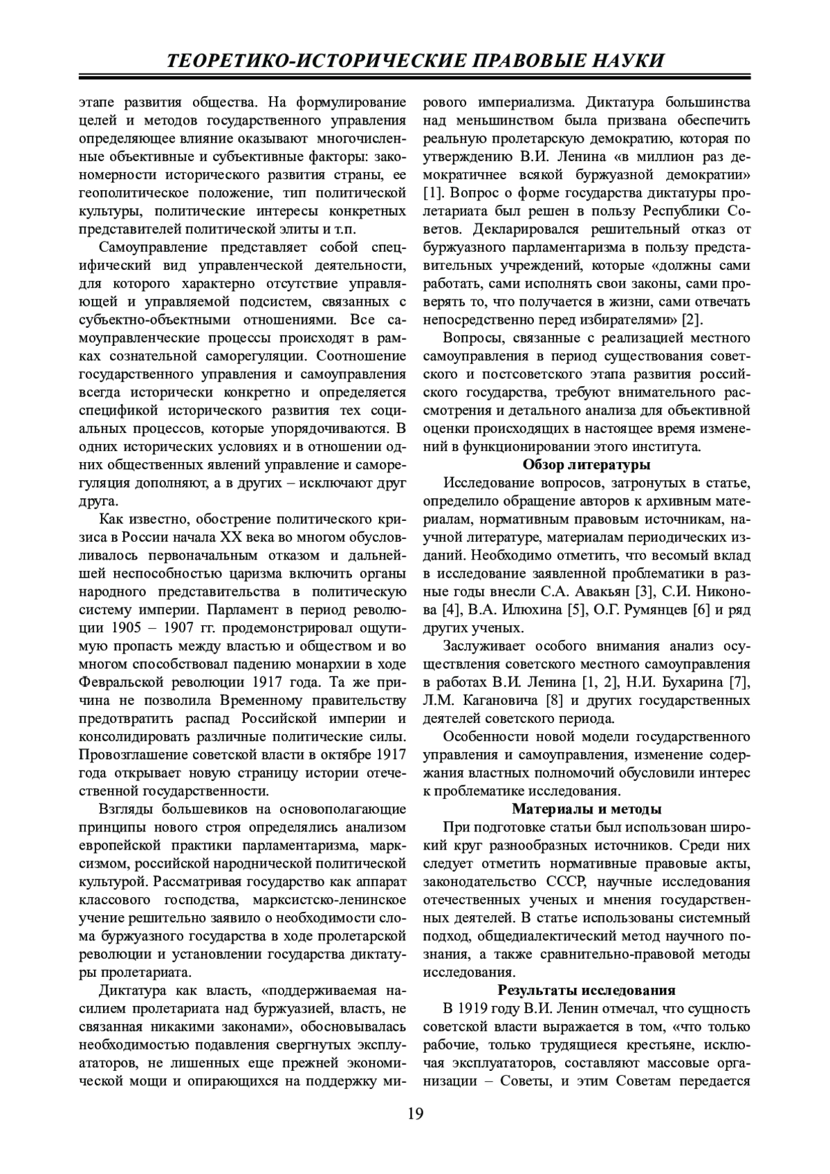 Обсуждение и заключение: авторы делают выводы о существенном изменении принципов организации и функционирования системы органов местного самоуправления в зависимости от проведения конституционных реформ, о незавершенности процесса формирования эффективно функционирующей системы реализации местной власти в советском обществе, что во многом определятся динамикой политической практики и необходимостью ее разностороннего теоретического осмысления