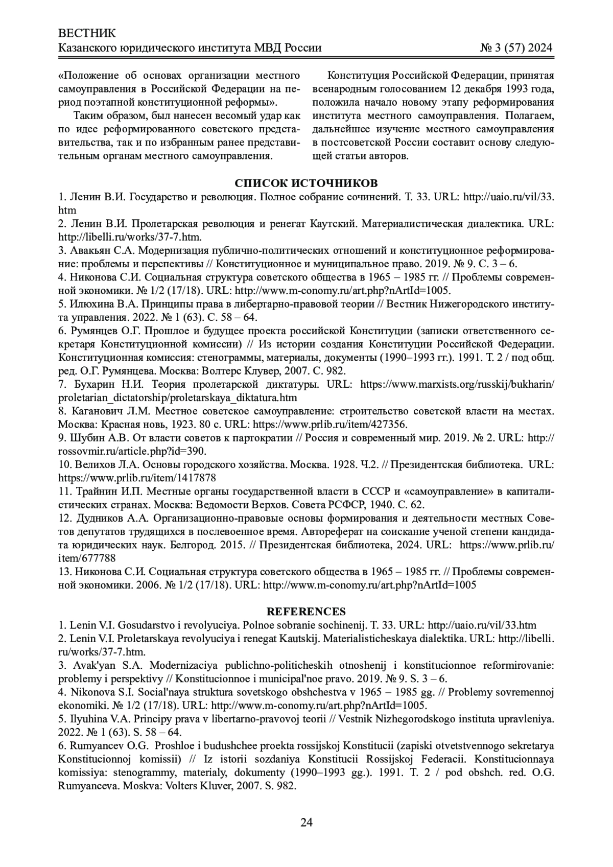 3. 	Авакьян С.А. Модернизация публично-политических отношений и конституционное реформирование: проблемы и перспективы // Конституционное и муниципальное право. 2019. № 9. С. 3 - 6. EDN: UEXVIO