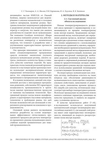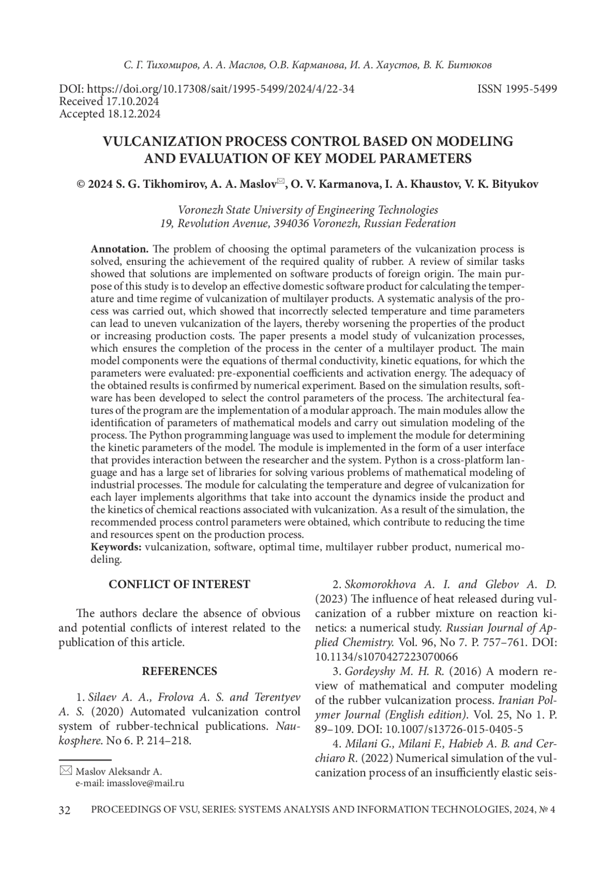 10. 	Tikhomirov S. Determination of thermophysical characteristics of vulcanizable rubber products by the mathematical modeling method / S. G. Tikhomirov, Y. V. Pyatakov, A. A. Maslov, O. V. Karmanova // Journal of Physics: Conference Series, Voronezh, 18-20 декабря 2017 года. Vol. 973. - Voronezh: Institute of Physics Publishing, 2018. - P. 012048. DOI: 10.1007/s10556018-0394-2