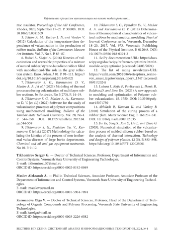 8. 	Тихомиров С. Г. Программное обеспечение для исследования процессов вулканизации полимерных композиций с помощью математического моделирования / С. Г. Тихомиров, А. А. Маслов, О. В. Карманова [и др.] // Вестник Тамбовского государственного технического университета. - 2022. - Т. 28, № 4. - С. 544-558. 10.17277/vestnik.2022.04. pp.544-558. DOI: 10.17277/vestnik.2022.04.pp.544-558 EDN: VGNMBY