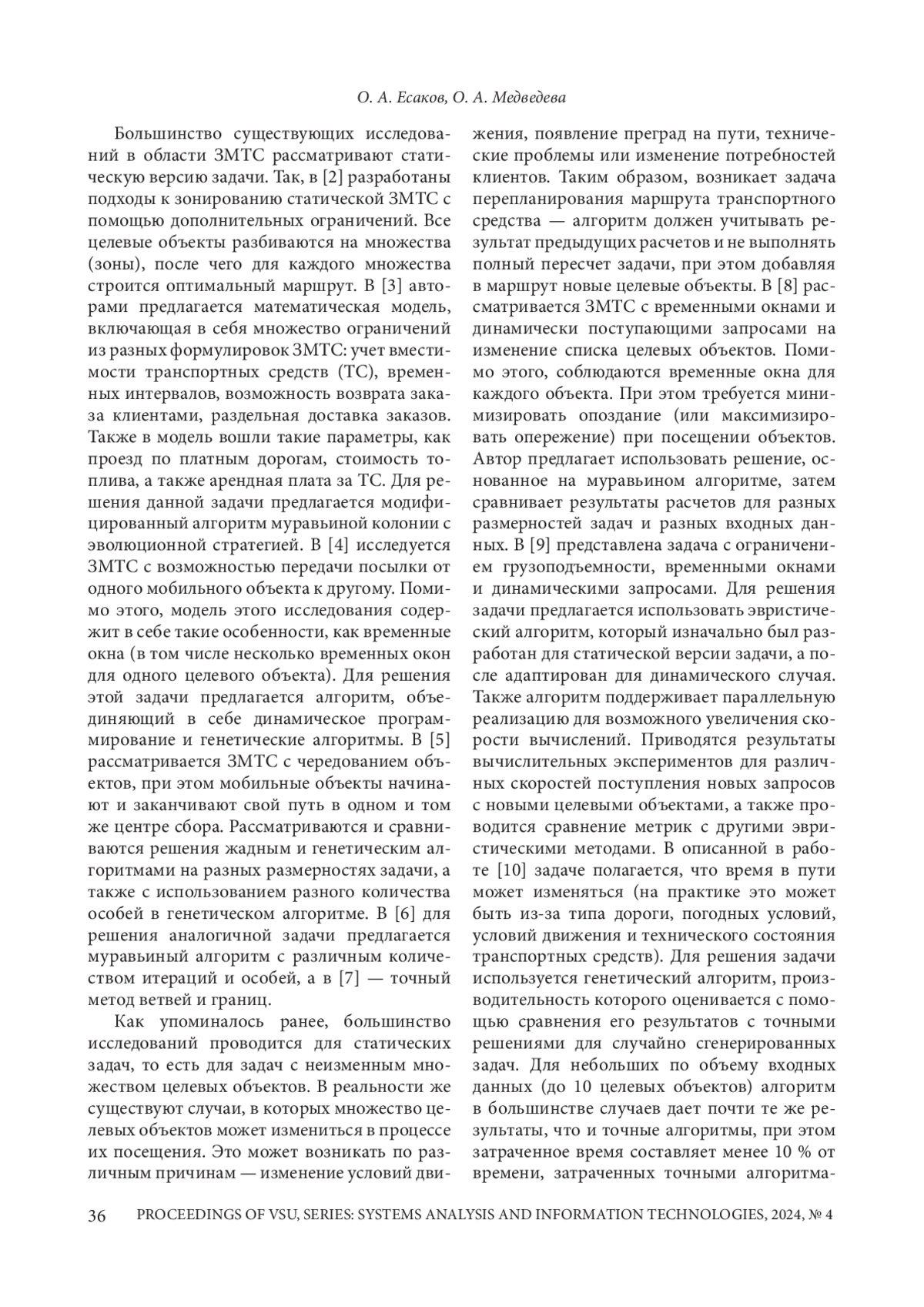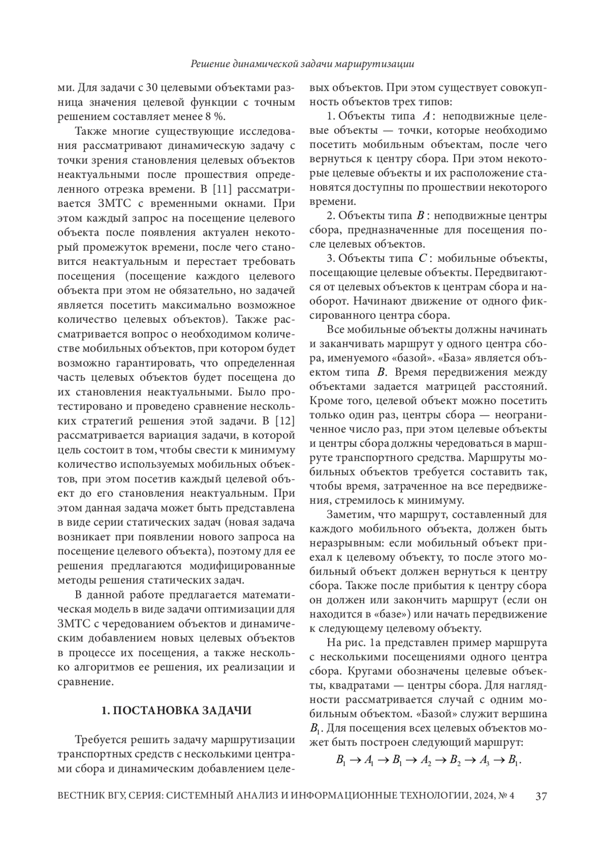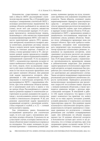 Большинство существующих исследований в области ЗМТС рассматривают статическую версию задачи. Так, в [2] разработаны подходы к зонированию статической ЗМТС с помощью дополнительных ограничений. Все целевые объекты разбиваются на множества (зоны), после чего для каждого множества строится оптимальный маршрут. В [3] авторами предлагается математическая модель, включающая в себя множество ограничений из разных формулировок ЗМТС: учет вместимости транспортных средств (ТС), временных интервалов, возможность возврата заказа клиентами, раздельная доставка заказов. Также в модель вошли такие параметры, как проезд по платным дорогам, стоимость топлива, а также арендная плата за ТС.
