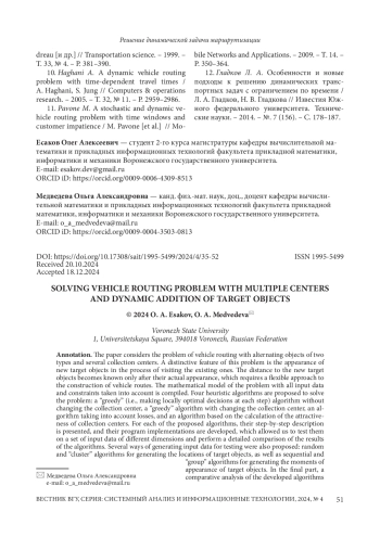 5. 	Medvedev S. The vehicle routing problem for several agents among the objects of two types / S. Medvedev, A. Sorokina, O. Medvedeva // 2019 XXI International Conference Complex Systems: Control and Modeling Problems. - 2019. - P. 535-540. EDN: AENZFW