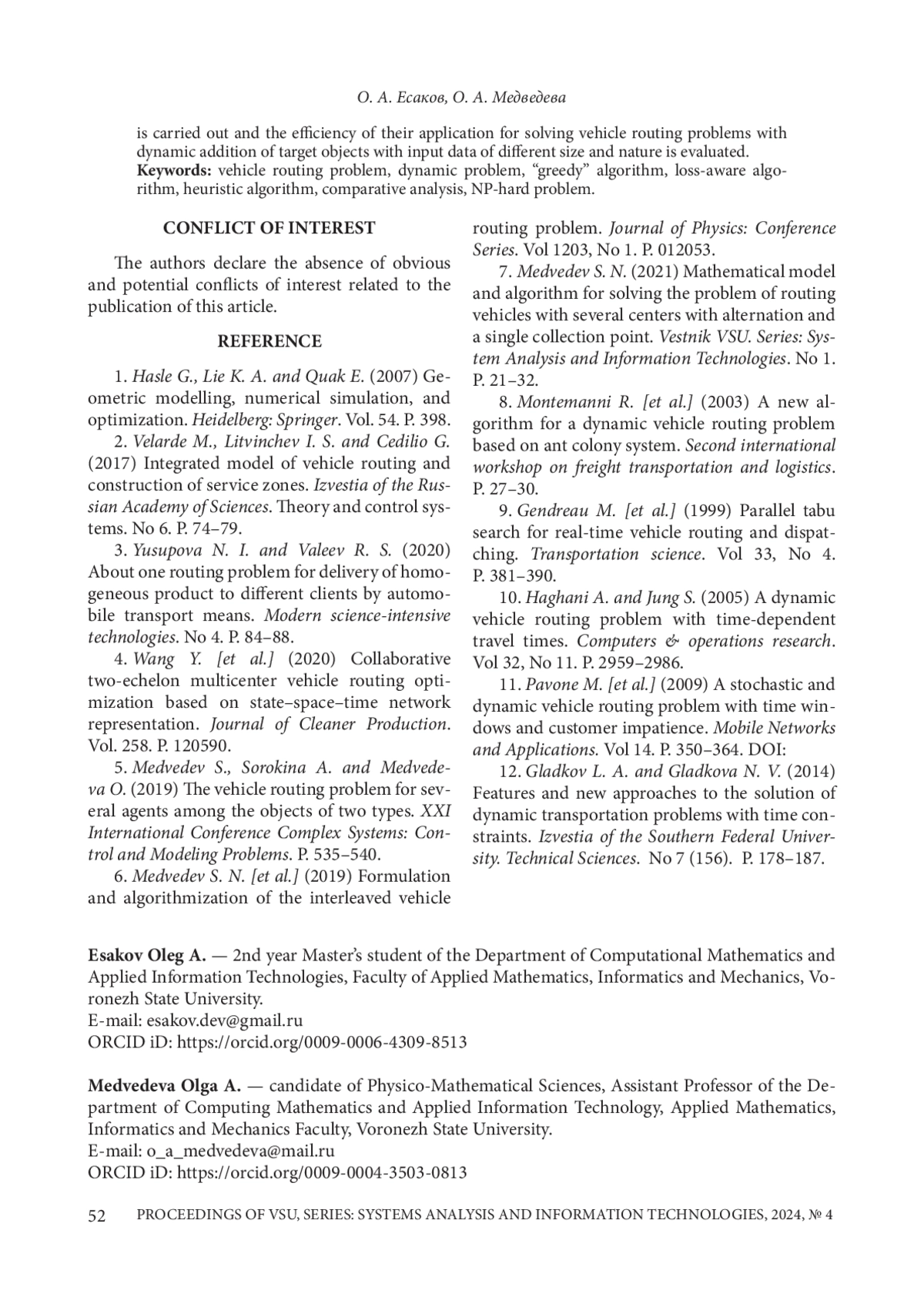 6. 	Medvedev S. N. Formulation and algorithmization of the interleaved vehicle routing problem / S. N. Medvedev [и др.] // Journal of Physics: Conference Series. - 2019. - Т. 1203, № 1. - P. 012053. EDN: WUZVAJ