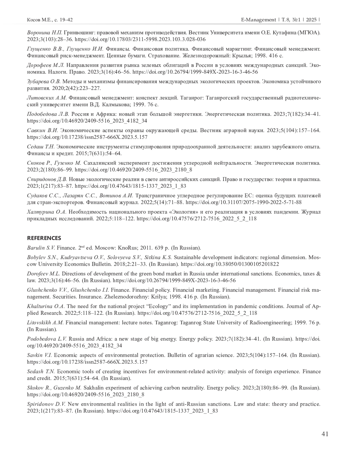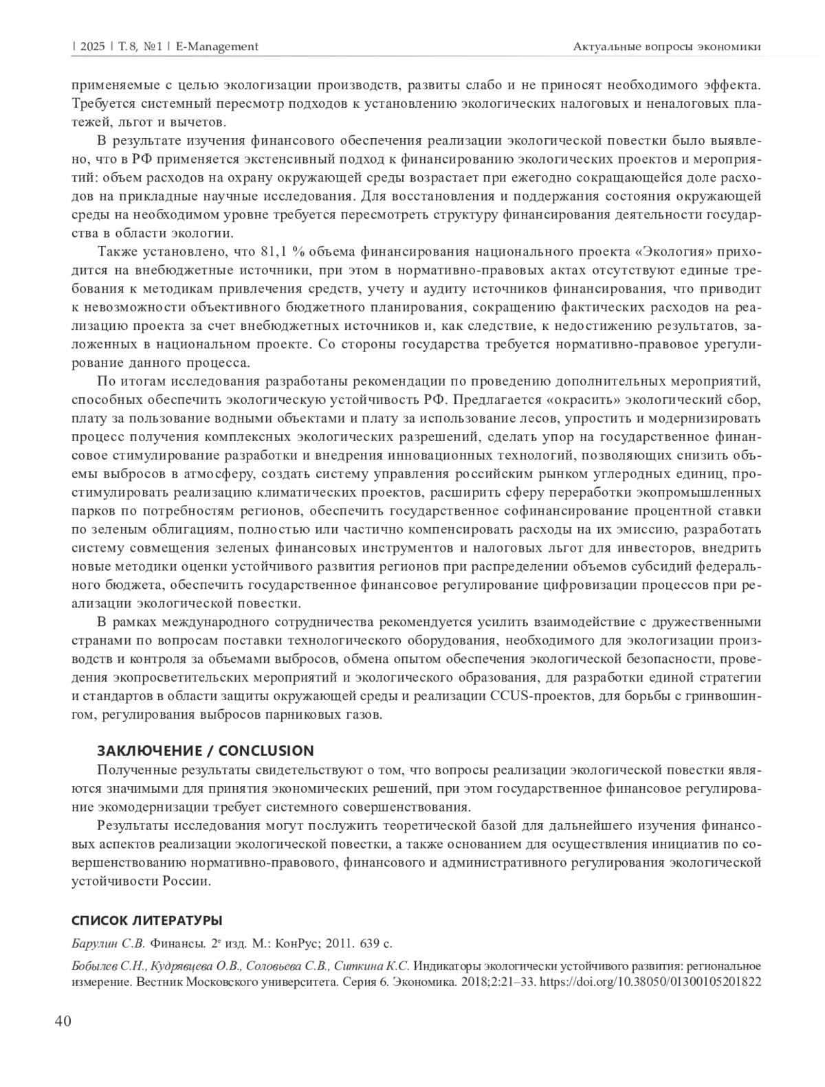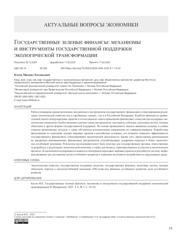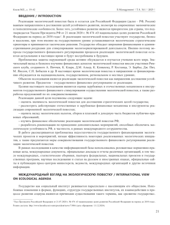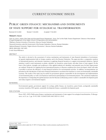 Работа посвящена оценке различных механизмов и инструментов государственного финансового стимулирования реализации экологической повестки как в зарубежных странах, так и в Российской Федерации. В работе проводится сравнительный анализ международных практик и отечественного опыта применения финансовых стимулов для поддержки экологических инициатив. Особое внимание уделено таким инструментам, как гранты, субсидии, налоговые льготы, зеленые облигации и другие формы государственной поддержки. На основе проведенного анализа выявлены сильные и слабые стороны применяемых методов, а также обозначены потенциальные направления их совершенствования. Разработаны предложения по адаптации лучших мировых практик к российским условиям, что позволит повысить эффективность государственного финансового стимулирования экологической деятельности. Кроме того, представлены рекомендации по внедрению инновационных финансовых инструментов, способствующих ускорению перехода к более экологически устойчивой экономике. Результаты исследования могут быть полезны для государственных органов, ответственных за разработку и реализацию экологической политики, а также для бизнеса, заинтересованного в участии в экологических проектах. В заключении подчеркивается важность интеграции передовых мировых практик в российскую систему экофинансирования для достижения целей устойчивого развития и снижения негативного воздействия на окружающую среду.
