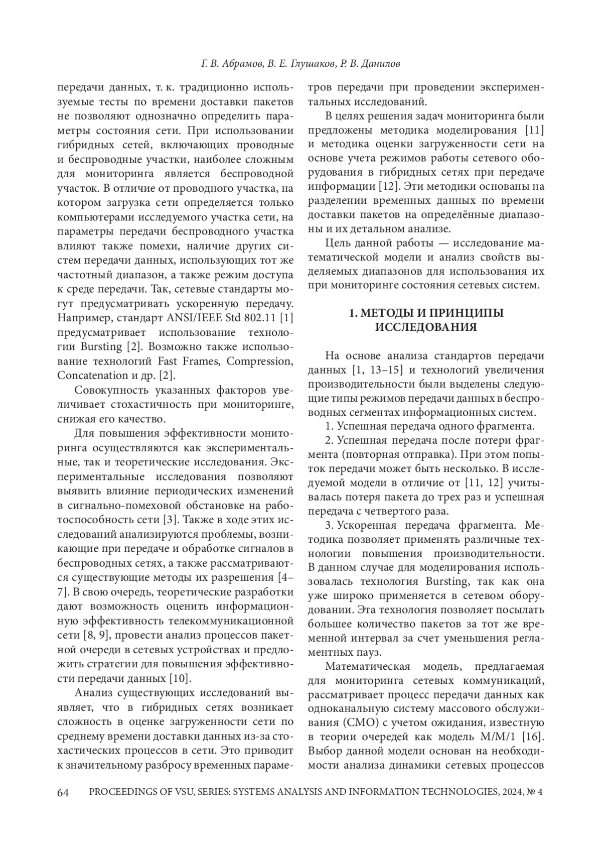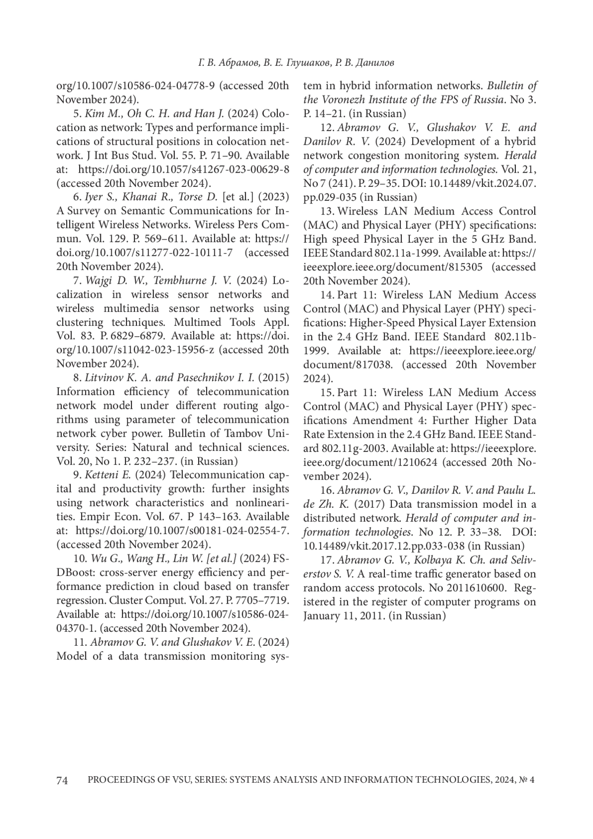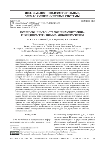 12. 	Абрамов Г. В. Разработка системы мониторинга загруженности гибридных сетей / Г. В. Абрамов, В. Е. Глушаков, Р. В. Данилов // Вестник компьютерных и информационных технологий. - 2024. - Т. 21, № 7 (241). - С. 29-. DOI: 10.14489/vkit.2024.07.pp.029-035 EDN: AOQFQP
