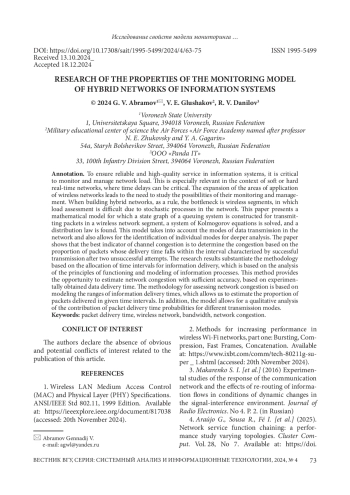 11. 	Абрамов Г. В. Модель системы мониторинга передачи данных в гибридных сетях / Г. В. Абрамов, В. Е. Глушаков // Вестник Воронежского института ФСИН России. - 2024. - № 3. - С. 14-21. EDN: FNFJYK