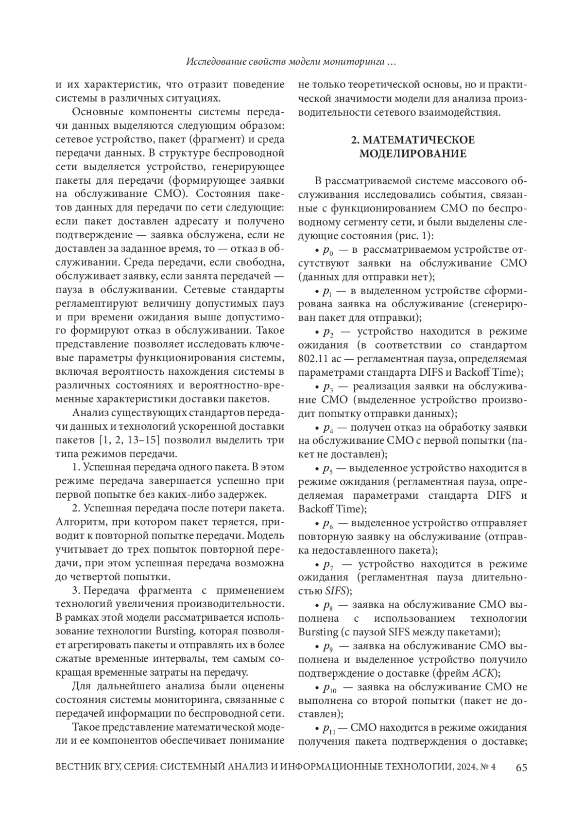 Для обеспечения надежного и качественного обслуживания в информационных системах критически важно осуществлять мониторинг и управление загруженностью сети. Это особенно актуально в контексте сетей мягкого или жесткого реального времени, где временные задержки могут иметь решающее значение. Расширение областей применения беспроводных сетей приводит к необходимости исследования возможностей их мониторинга и управления. При построении гибридных сетей, как правило, «узким» местом являются беспроводные сегменты, в которых затруднена оценка загруженности из-за стохастических процессов в сети. В данной работе представлена математическая модель, для которой строится граф состояний системы массового обслуживания при передаче пакетов в беспроводном сегменте сети, решается система уравнений Колмогорова и находится закон распределения. Данная модель учитывает режимы передачи данных в сети, а также позволяет выделять отдельные режимы для более глубокого анализа. В статье показано, что лучшим показателем загруженности канала является определение загрузки на основе доли пакетов, время доставки которых попадает в интервал, характеризующийся успешной передачей после двух неудачных попыток. Результаты исследований обосновывают методику, основанную на выделении временных интервалов доставки информации, которая базируется на анализе принципов функционирования и моделировании информационных процессов. Данная методика предоставляет возможность с достаточной точностью оценить загруженность сети, опираясь на экспериментально полученное время доставки данных. Методология оценки загруженности сети основывается на моделировании диапазонов времени доставки информации, что позволяет оценить долю пакетов, доставленных в заданные временные интервалы. Кроме того, модель позволяет осуществлять качественный анализ вклада вероятностей времени доставки пакетов для различных режимов передачи.