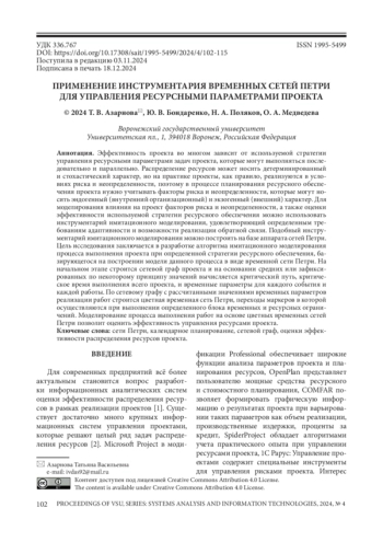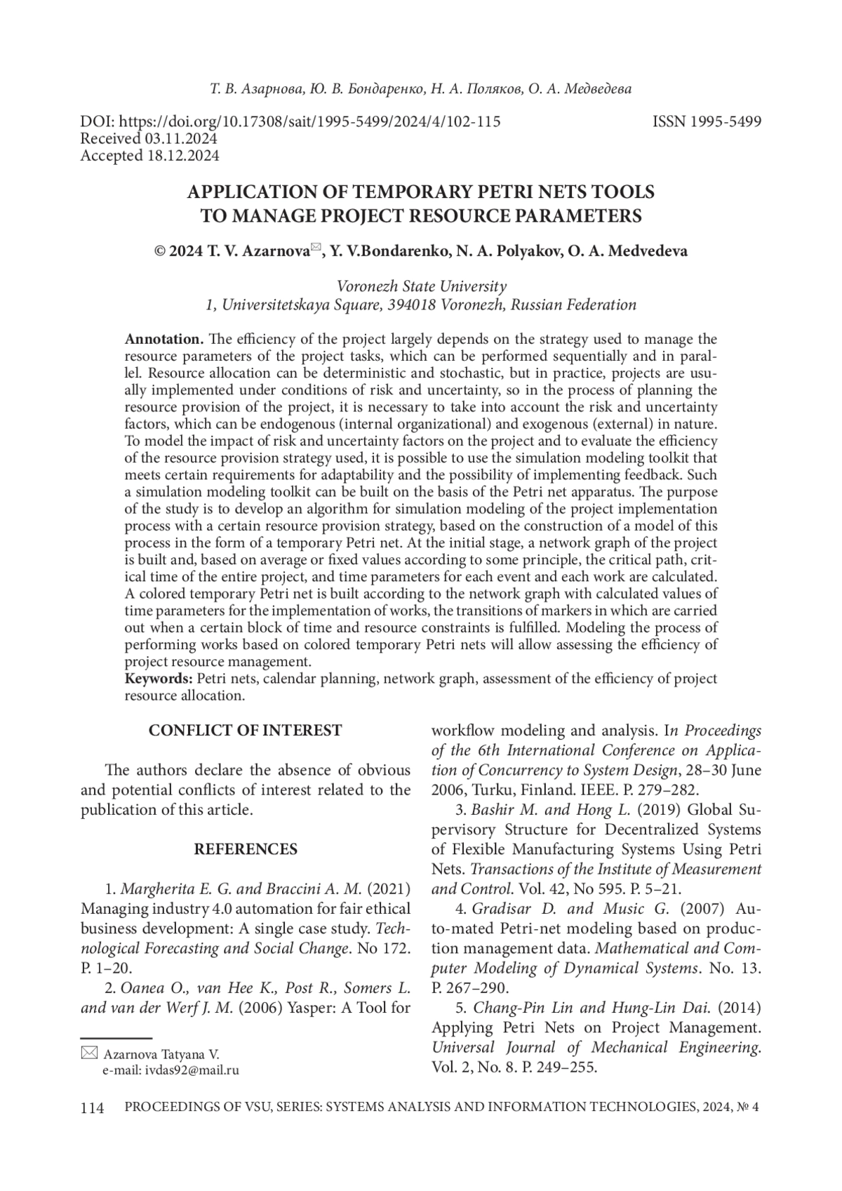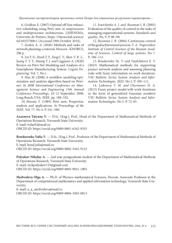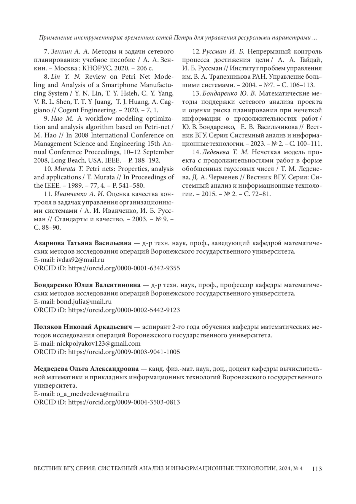 13. 	Бондаренко Ю. В. Математические методы поддержки сетевого анализа проекта и оценки риска планирования при нечеткой информации о продолжительностях работ / Ю. В. Бондаренко, Е. В. Васильчикова // Вестник ВГУ. Серия: Системный анализ и информационные технологии. - 2023. - № 2. - С. 100-111.