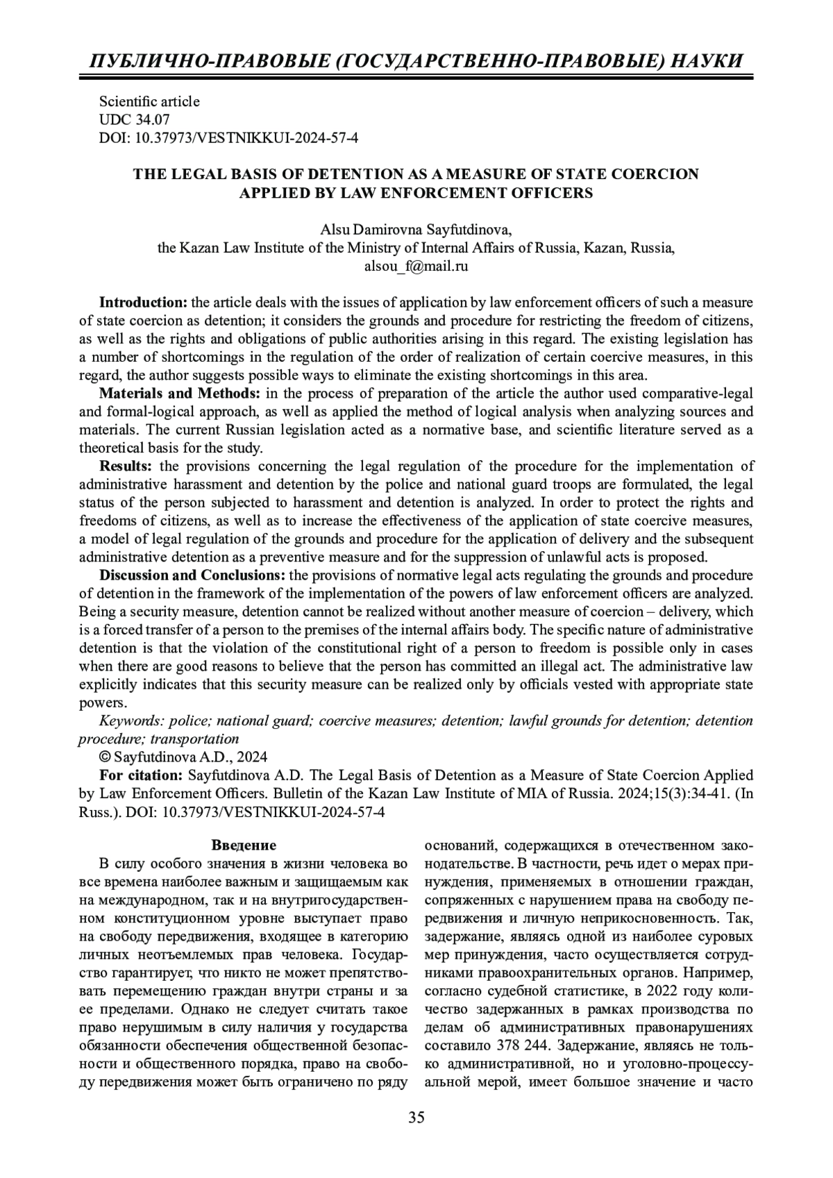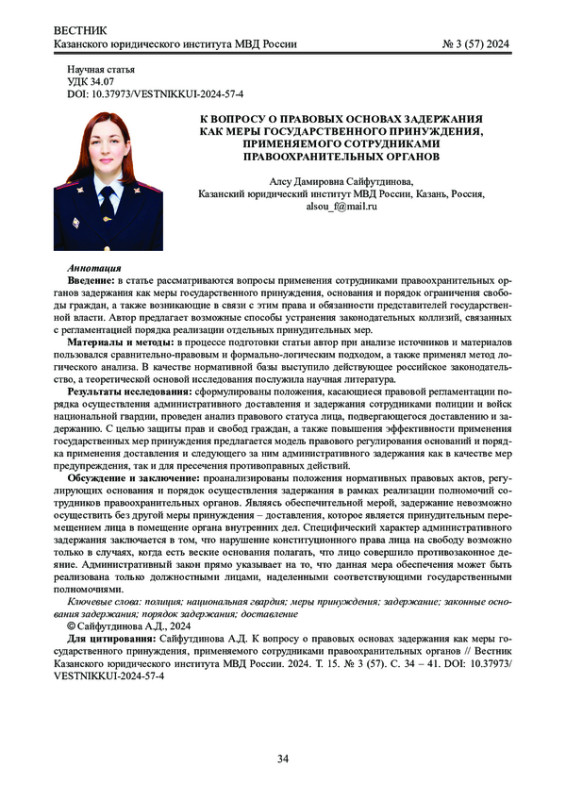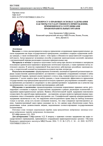 Обсуждение и заключение: проанализированы положения нормативных правовых актов, регулирующих основания и порядок осуществления задержания в рамках реализации полномочий сотрудников правоохранительных органов. Являясь обеспечительной мерой, задержание невозможно осуществить без другой меры принуждения - доставления, которое является принудительным перемещением лица в помещение органа внутренних дел. Специфический характер административного задержания заключается в том, что нарушение конституционного права лица на свободу возможно только в случаях, когда есть веские основания полагать, что лицо совершило противозаконное деяние. Административный закон прямо указывает на то, что данная мера обеспечения может быть реализована только должностными лицами, наделенными соответствующими государственными полномочиями.