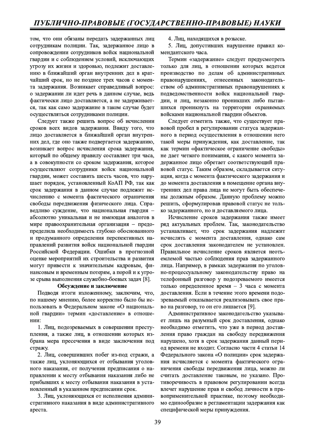 Результаты исследования: сформулированы положения, касающиеся правовой регламентации порядка осуществления административного доставления и задержания сотрудниками полиции и войск национальной гвардии, проведен анализ правового статуса лица, подвергающегося доставлению и задержанию. С целью защиты прав и свобод граждан, а также повышения эффективности применения государственных мер принуждения предлагается модель правового регулирования оснований и порядка применения доставления и следующего за ним административного задержания как в качестве мер предупреждения, так и для пресечения противоправных действий.