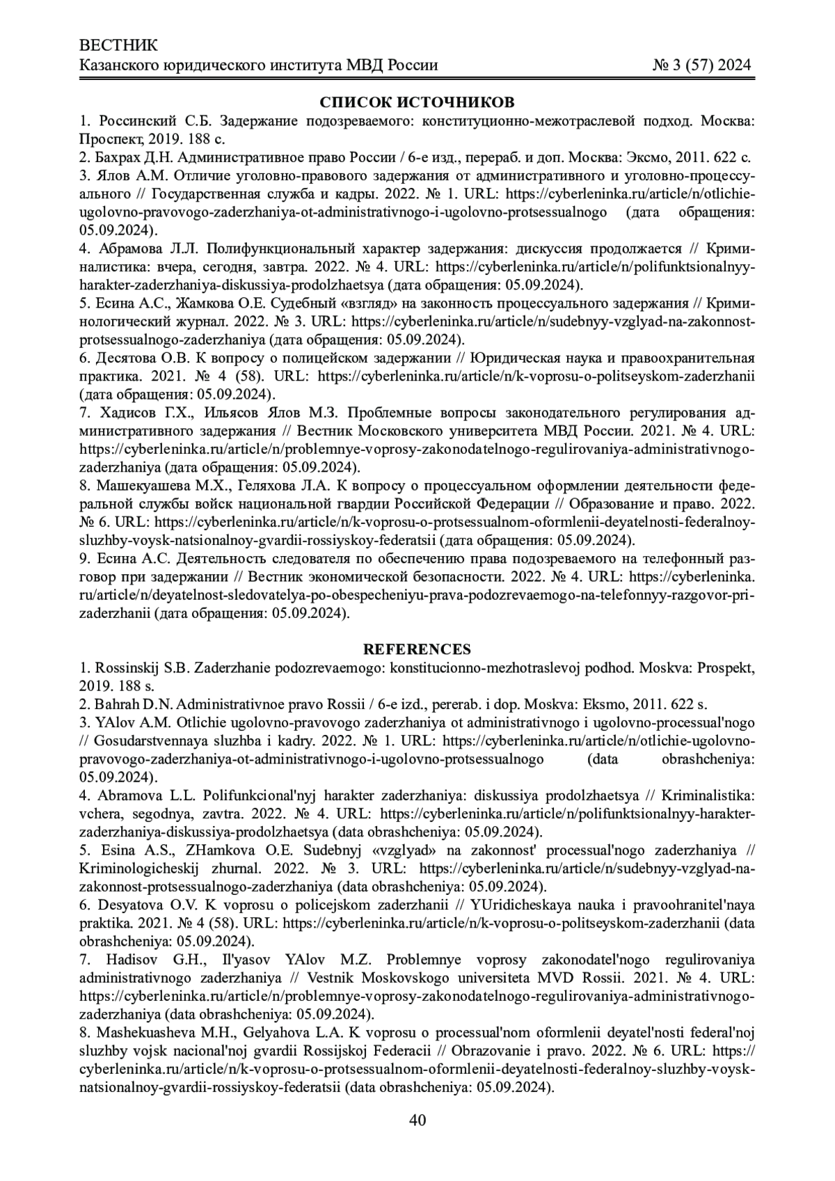 4. 	Абрамова Л.Л. Полифункциональный характер задержания: дискуссия продолжается // Криминалистика: вчера, сегодня, завтра. 2022. № 4. URL: https://cyberleninka.ru/article/n/polifunktsionalnyy-harakter-zaderzhaniya-diskussiya-prodolzhaetsya (дата обращения: 05.09.2024). EDN: WGCMRX